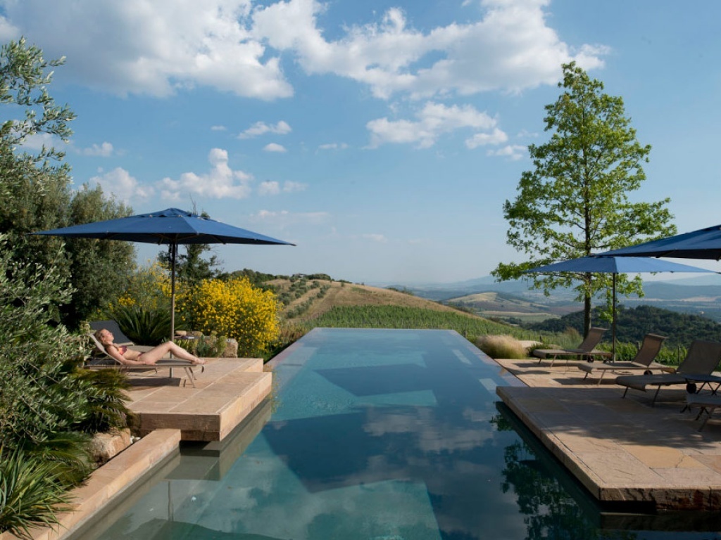 Next to the farmhouse, on the back of the hill, there is the swimming pool area shared with the other guests. At your disposal the infinity pool, lounge area and barbecue to fully enjoy the peace and beauty of nature and silence, thanks to the spectacular view over the Maremma countryside to the sea.