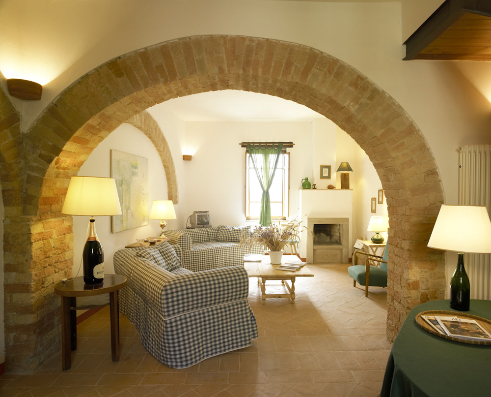 Large wooden beams on the ceiling, Tuscan terracotta flooring and a large antique fireplace give this suite a touch of rustic elegance. The bedroom and the large living room, furnished with taste and elegance, invite to a stay of complete relaxation and comfort. The suite has a bathroom with shower and a small separate kitchen. It has 52 square meters. walkable. Satellite TV and a Nespresso machine are part of the furniture.