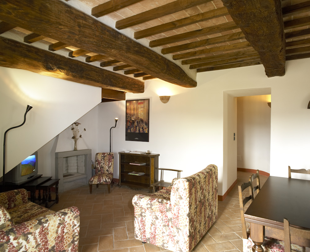 The apartment is located in the Torre Piccola. Measures 90 square meters net. In the past the lower floor was used for wine production. In the ancient cellar a beautiful bedroom has been created with a charming open bathroom, in which the terracotta tub for crushing the grapes has become a gigantic bathtub. From the room you have direct access to the private garden with a view of Perugia 15 km away. The first floor has a living room with a large fireplace and a kitchenette with dishwasher, oven and washing machine. There is also a second bathroom with shower. The living room leads to a wooden loft with two single beds. The apartment, in addition to the private garden, has a large terrace that divides with the other two apartments of the Torre Piccola.