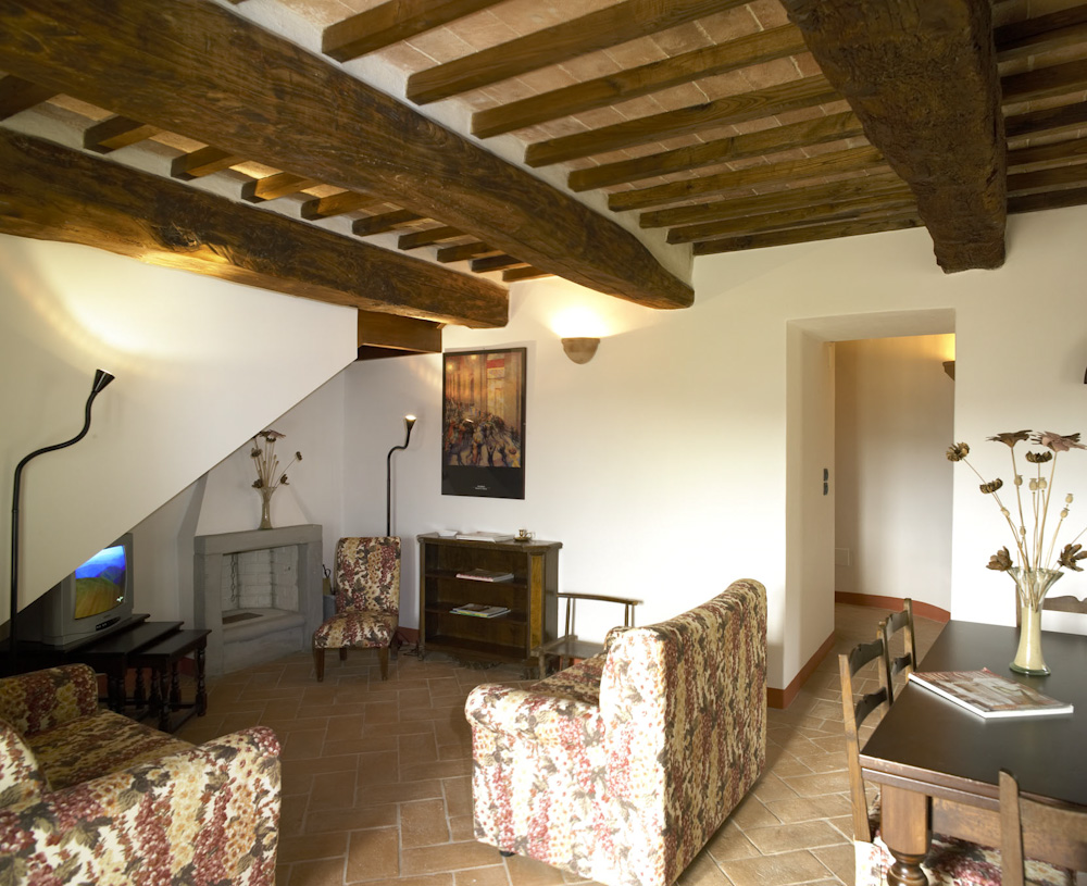 Large wooden beams on the ceiling, Tuscan terracotta flooring and a large antique fireplace give this suite a touch of rustic elegance. The bedroom and the large living room, furnished with taste and elegance, invite to a stay of complete relaxation and comfort. The suite has a bathroom with shower and a small separate kitchen. It has 52 square meters. walkable. Satellite TV and a Nespresso machine are part of the furniture.