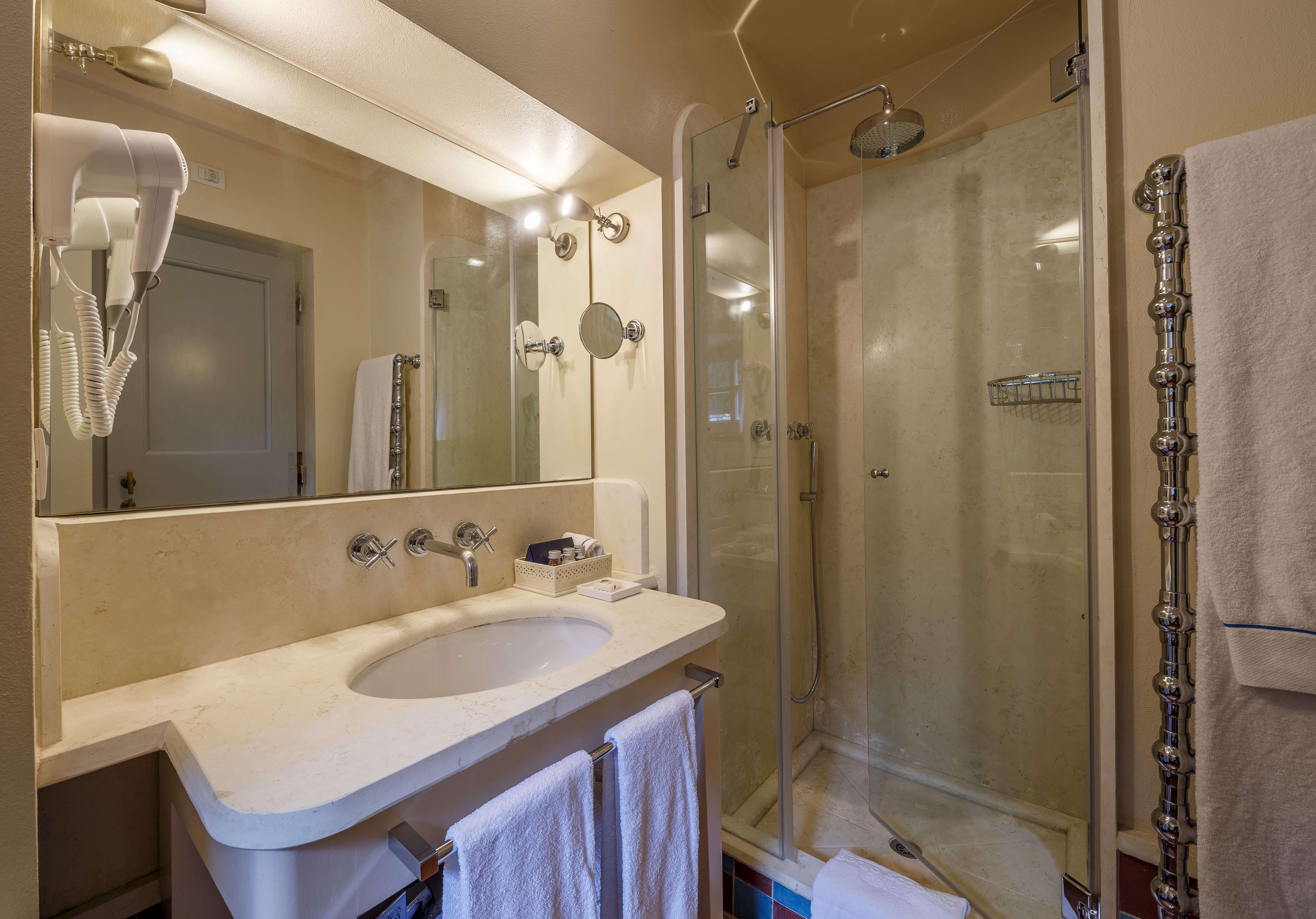 The bathrooms are in marble or are tiled, and have a shower and/or a bathtub.