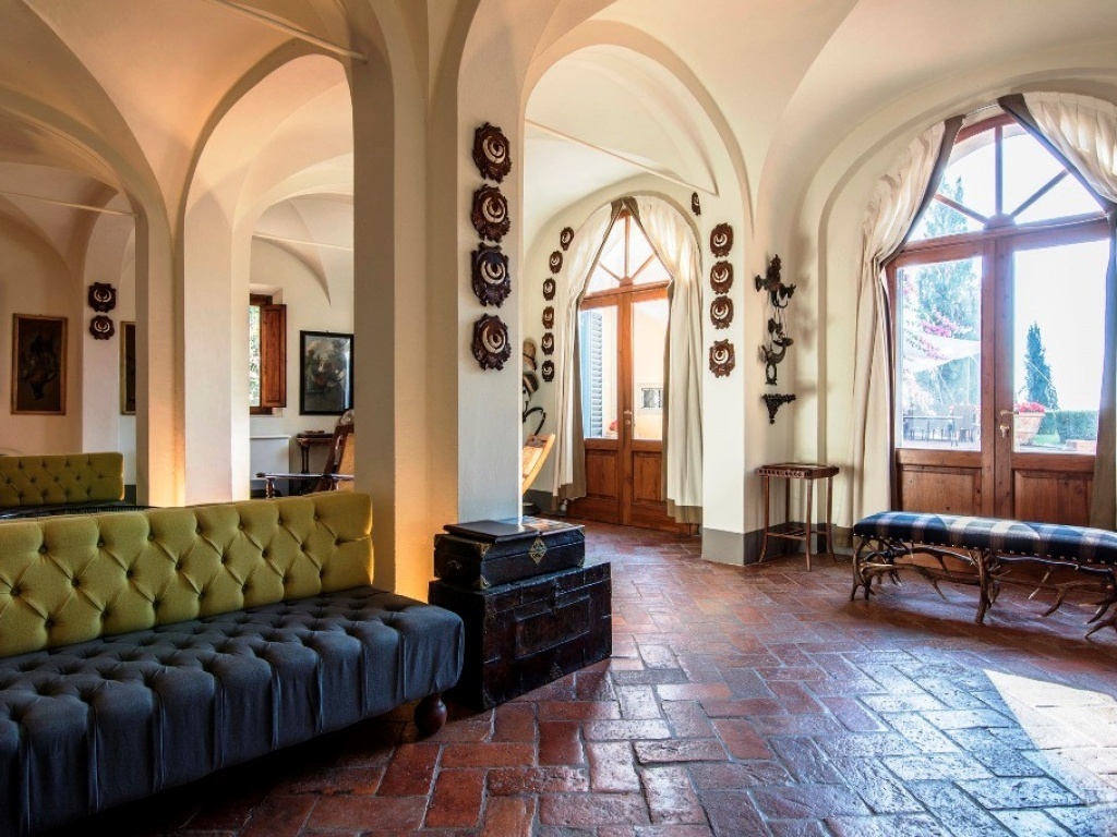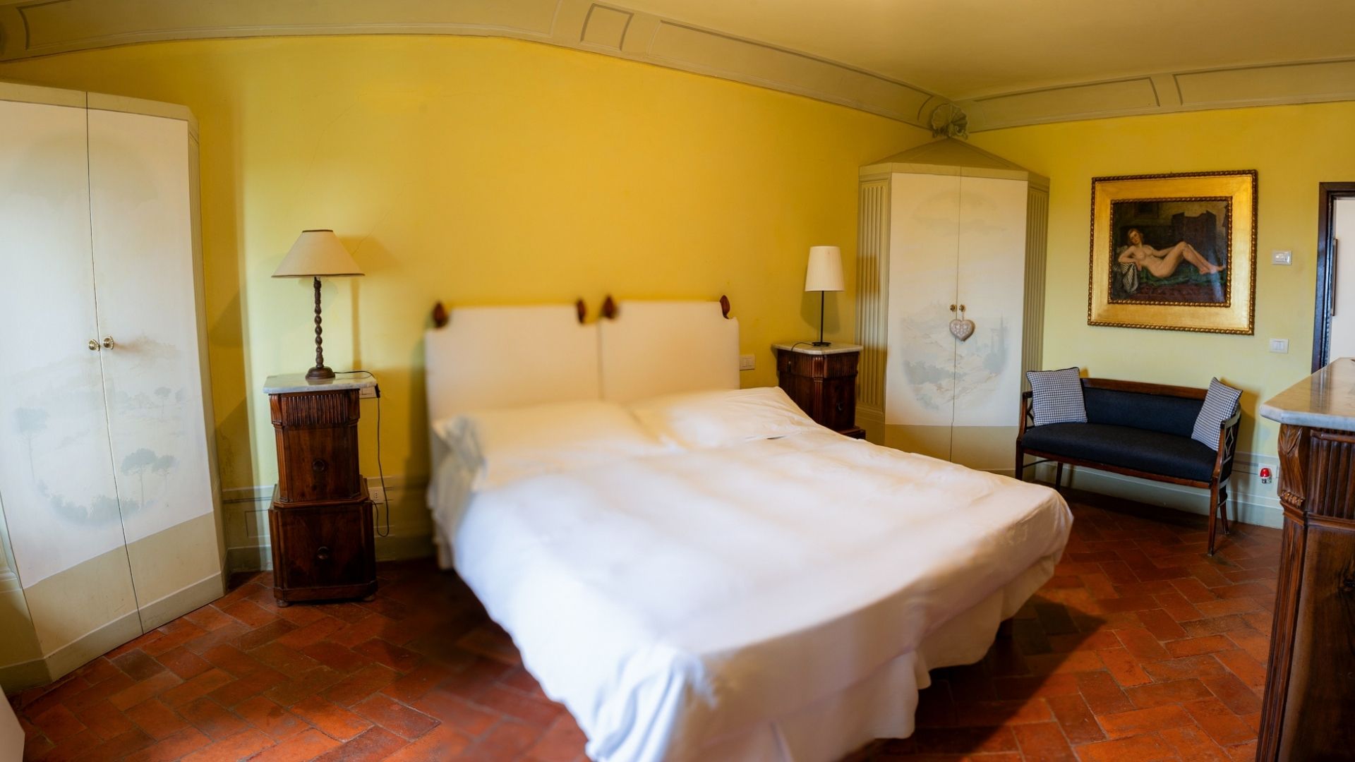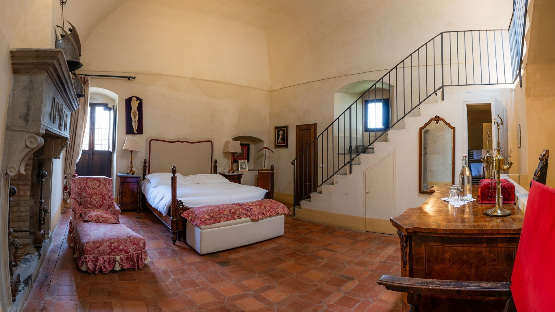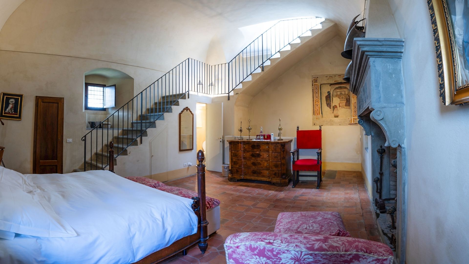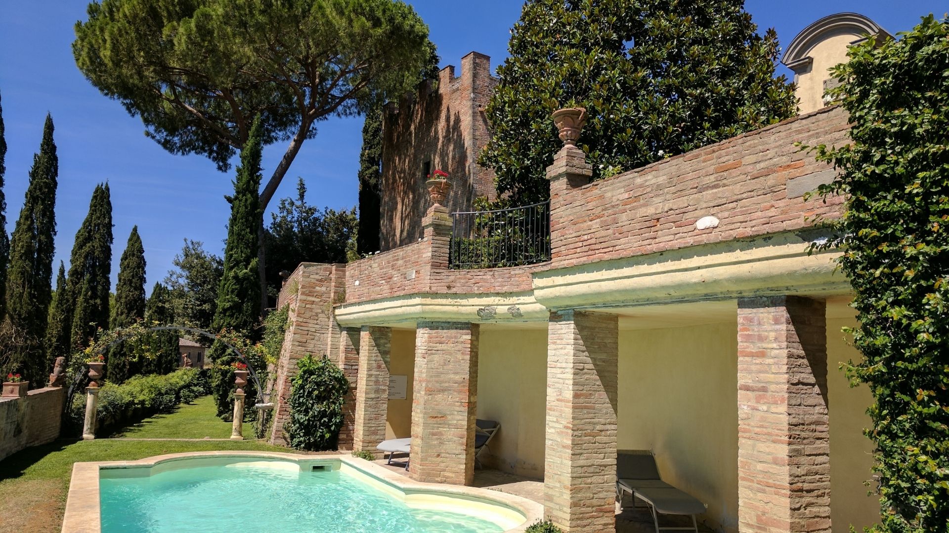 Independent villa for 12 people. On the ground floor, from the main entrance hall you can get to a vast and warm living room with a big fireplace. On the left, a marble staircase leads to the first floor. From the living room, a hallway leads to the rest of the villa. On the left, a big kitchen and completely furnished. Along the hallway, other than a guests bathroom, you can find a luxurious dining room with fireplace, a French window which lead to the courtyard. Going ahead, the Giallo living room with fireplace. On the left, the library with fireplace, a desk with computer, wifi and fax. On the left, the imperial bedroom Federico Barbarossa with ensuite bathroom and Jacuzzi. On the first floor, the marble staircase reach the first floor where you can get to four bedrooms through a long hallway: on the left, the double bedroom Gialla with ensuite bathroom, shower and Jacuzzi. On the left two tin bedrooms, the Azzurra and Rosa bedrooms, both with ensuite bathroom, shower and bath and shower and Jacuzzi. Going further, on the left there is the main double bedroom, Julia, with fireplace, balcony facing the courtyard, ensuite bathroom with shower and Jacuzzi. Going ahead, there is a room with ironing tools, wardrobes and a service staircase which joints Giallo living room. On the XII century tower the entrance is separated from the Villa. On the ground floor there is a living room, on the first floor a double bedroom with fireplace, bathroom. Terrace with a view. On the garden in front of the Villa is possible to view the typical Tuscan landscape: vineyards of the Fattoria and San Gimigano towers. A staircase leads to the inferior bastion through which you can get to the swimming pool (10x5m), surrounded by a garden and in the shade of a loggia. On the rear of it, a shower and a fridge. A lemon grove has been converted into a living room facing the garden, and the terrace offers a great view. A parasol outdoors in front of the lemon grove. There is also a deconsecrated chapel dating from 1210 dedicated to San Bartolomeo and refurbished in the ‘700, the crypt is from the XIII century. There is also a “torchio” for grapes squeezing from 1743 and a wine colletiong available for guests.