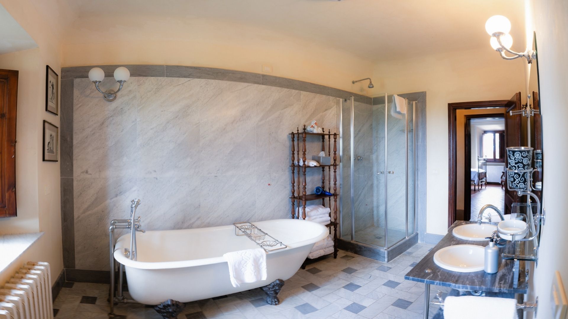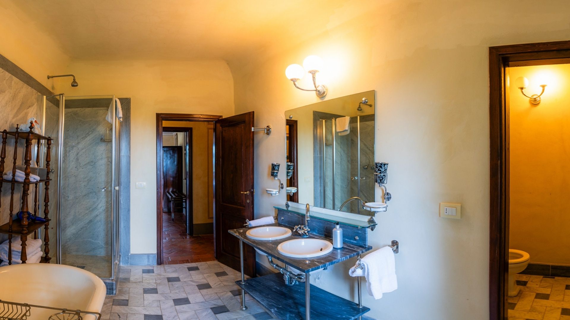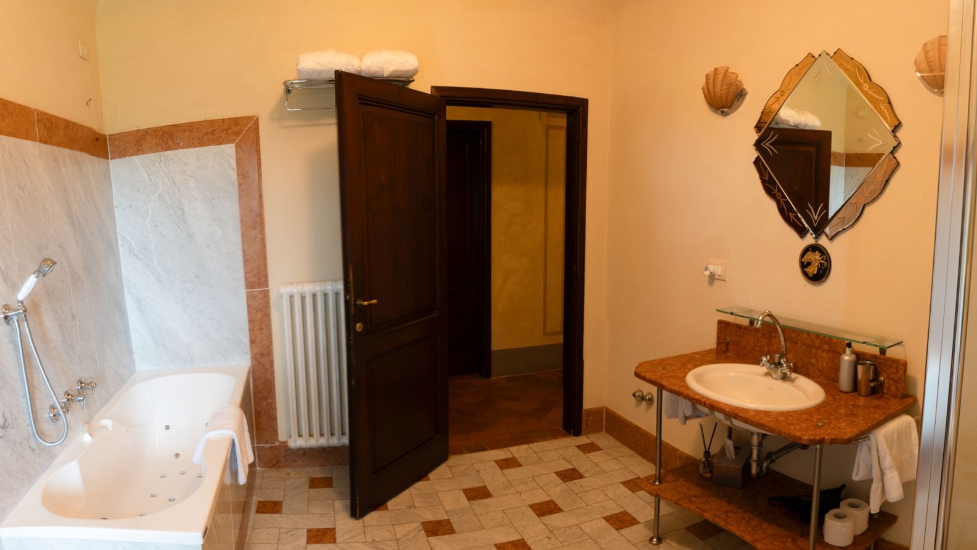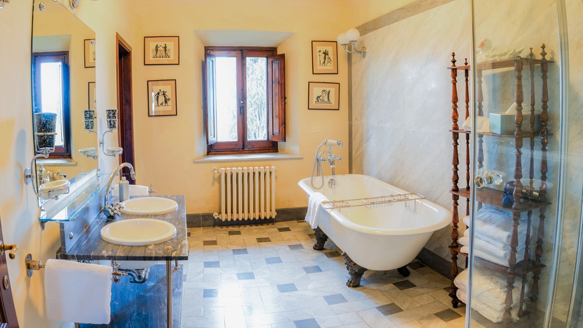 Independent villa for 12 people. On the ground floor, from the main entrance hall you can get to a vast and warm living room with a big fireplace. On the left, a marble staircase leads to the first floor. From the living room, a hallway leads to the rest of the villa. On the left, a big kitchen and completely furnished. Along the hallway, other than a guests bathroom, you can find a luxurious dining room with fireplace, a French window which lead to the courtyard. Going ahead, the Giallo living room with fireplace. On the left, the library with fireplace, a desk with computer, wifi and fax. On the left, the imperial bedroom Federico Barbarossa with ensuite bathroom and Jacuzzi. On the first floor, the marble staircase reach the first floor where you can get to four bedrooms through a long hallway: on the left, the double bedroom Gialla with ensuite bathroom, shower and Jacuzzi. On the left two tin bedrooms, the Azzurra and Rosa bedrooms, both with ensuite bathroom, shower and bath and shower and Jacuzzi. Going further, on the left there is the main double bedroom, Julia, with fireplace, balcony facing the courtyard, ensuite bathroom with shower and Jacuzzi. Going ahead, there is a room with ironing tools, wardrobes and a service staircase which joints Giallo living room. On the XII century tower the entrance is separated from the Villa. On the ground floor there is a living room, on the first floor a double bedroom with fireplace, bathroom. Terrace with a view. On the garden in front of the Villa is possible to view the typical Tuscan landscape: vineyards of the Fattoria and San Gimigano towers. A staircase leads to the inferior bastion through which you can get to the swimming pool (10x5m), surrounded by a garden and in the shade of a loggia. On the rear of it, a shower and a fridge. A lemon grove has been converted into a living room facing the garden, and the terrace offers a great view. A parasol outdoors in front of the lemon grove. There is also a deconsecrated chapel dating from 1210 dedicated to San Bartolomeo and refurbished in the ‘700, the crypt is from the XIII century. There is also a “torchio” for grapes squeezing from 1743 and a wine colletiong available for guests.