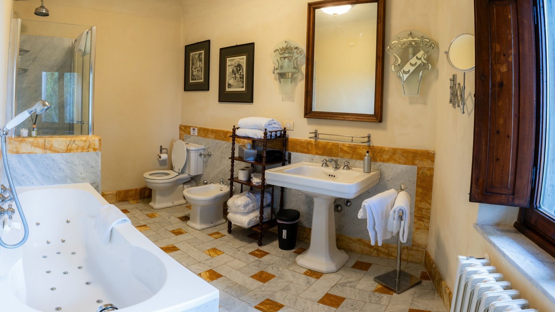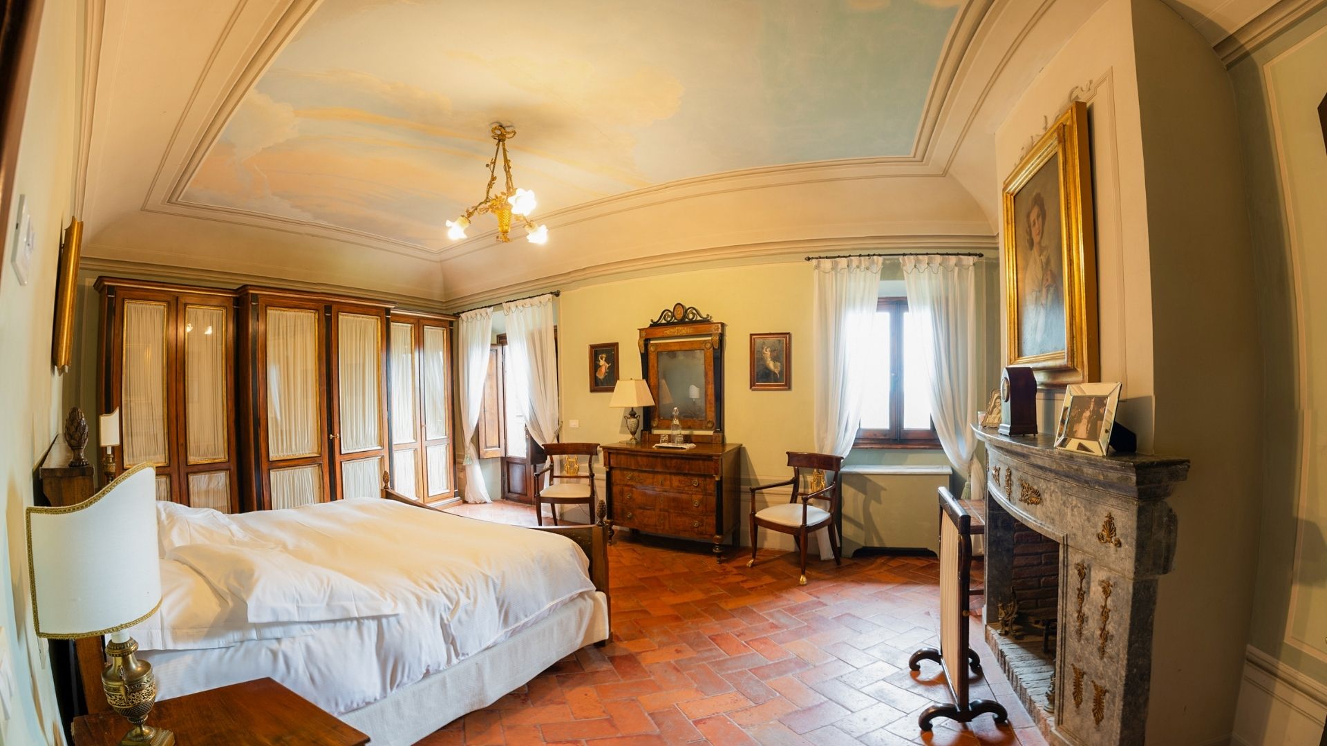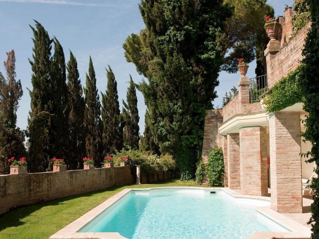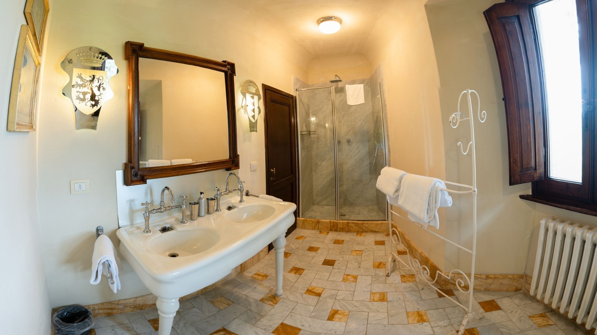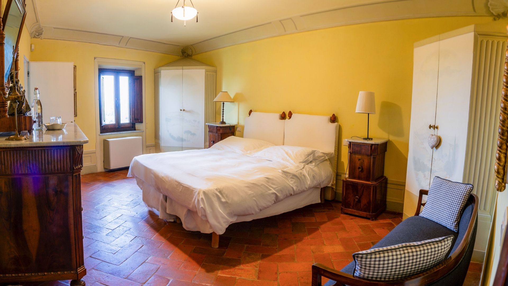 Independent villa for 12 people. On the ground floor, from the main entrance hall you can get to a vast and warm living room with a big fireplace. On the left, a marble staircase leads to the first floor. From the living room, a hallway leads to the rest of the villa. On the left, a big kitchen and completely furnished. Along the hallway, other than a guests bathroom, you can find a luxurious dining room with fireplace, a French window which lead to the courtyard. Going ahead, the Giallo living room with fireplace. On the left, the library with fireplace, a desk with computer, wifi and fax. On the left, the imperial bedroom Federico Barbarossa with ensuite bathroom and Jacuzzi. On the first floor, the marble staircase reach the first floor where you can get to four bedrooms through a long hallway: on the left, the double bedroom Gialla with ensuite bathroom, shower and Jacuzzi. On the left two tin bedrooms, the Azzurra and Rosa bedrooms, both with ensuite bathroom, shower and bath and shower and Jacuzzi. Going further, on the left there is the main double bedroom, Julia, with fireplace, balcony facing the courtyard, ensuite bathroom with shower and Jacuzzi. Going ahead, there is a room with ironing tools, wardrobes and a service staircase which joints Giallo living room. On the XII century tower the entrance is separated from the Villa. On the ground floor there is a living room, on the first floor a double bedroom with fireplace, bathroom. Terrace with a view. On the garden in front of the Villa is possible to view the typical Tuscan landscape: vineyards of the Fattoria and San Gimigano towers. A staircase leads to the inferior bastion through which you can get to the swimming pool (10x5m), surrounded by a garden and in the shade of a loggia. On the rear of it, a shower and a fridge. A lemon grove has been converted into a living room facing the garden, and the terrace offers a great view. A parasol outdoors in front of the lemon grove. There is also a deconsecrated chapel dating from 1210 dedicated to San Bartolomeo and refurbished in the ‘700, the crypt is from the XIII century. There is also a “torchio” for grapes squeezing from 1743 and a wine colletiong available for guests.