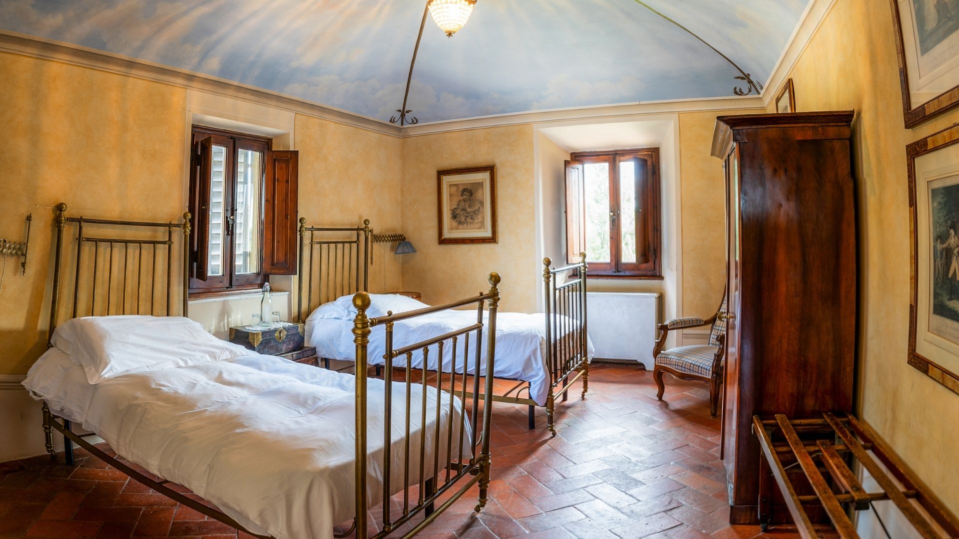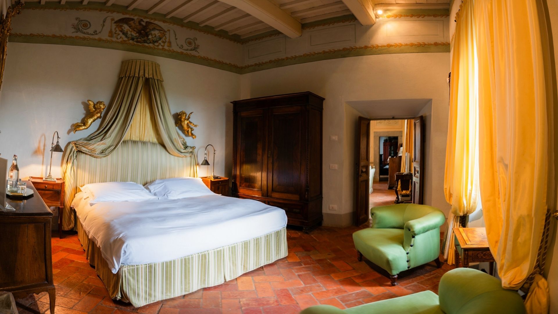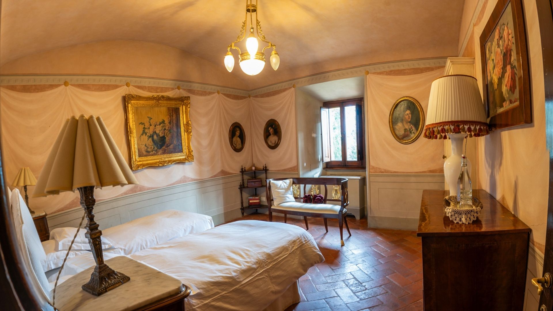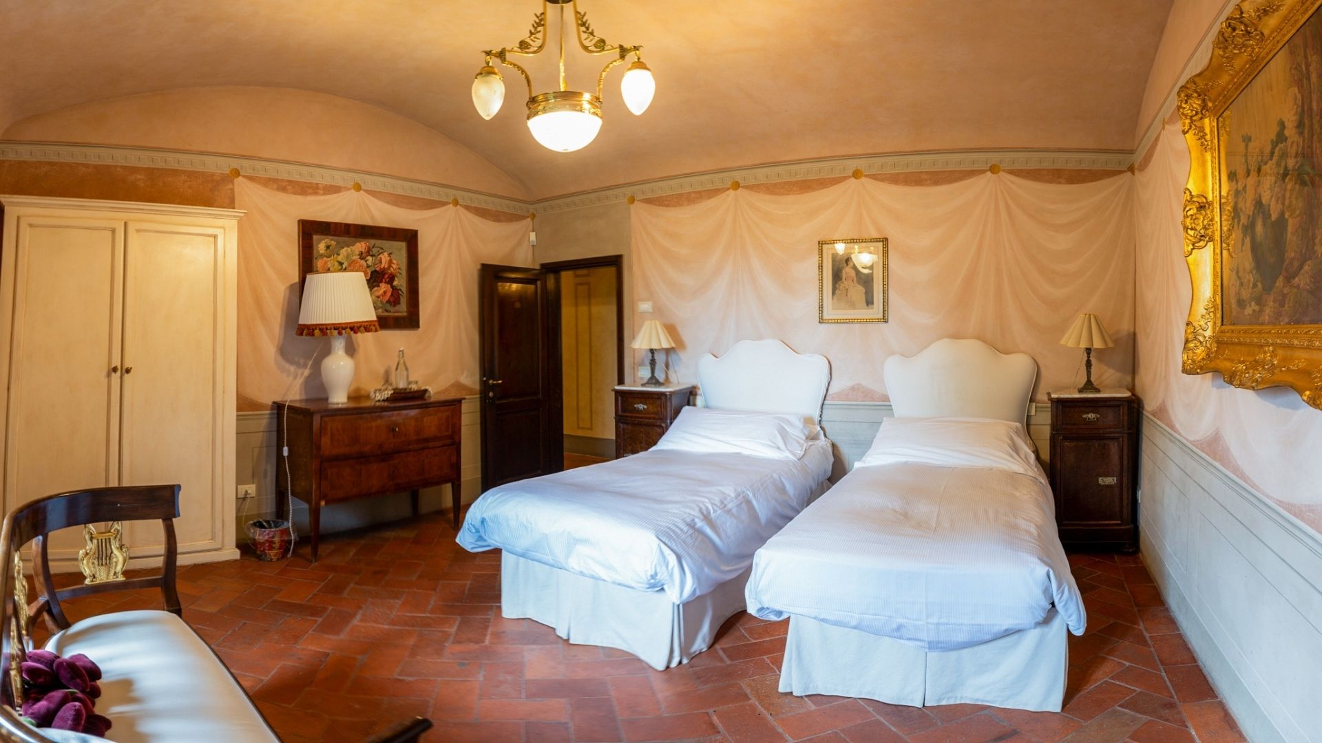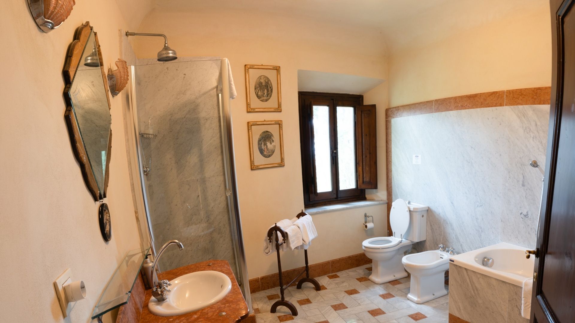 Independent villa for 12 people. On the ground floor, from the main entrance hall you can get to a vast and warm living room with a big fireplace. On the left, a marble staircase leads to the first floor. From the living room, a hallway leads to the rest of the villa. On the left, a big kitchen and completely furnished. Along the hallway, other than a guests bathroom, you can find a luxurious dining room with fireplace, a French window which lead to the courtyard. Going ahead, the Giallo living room with fireplace. On the left, the library with fireplace, a desk with computer, wifi and fax. On the left, the imperial bedroom Federico Barbarossa with ensuite bathroom and Jacuzzi. On the first floor, the marble staircase reach the first floor where you can get to four bedrooms through a long hallway: on the left, the double bedroom Gialla with ensuite bathroom, shower and Jacuzzi. On the left two tin bedrooms, the Azzurra and Rosa bedrooms, both with ensuite bathroom, shower and bath and shower and Jacuzzi. Going further, on the left there is the main double bedroom, Julia, with fireplace, balcony facing the courtyard, ensuite bathroom with shower and Jacuzzi. Going ahead, there is a room with ironing tools, wardrobes and a service staircase which joints Giallo living room. On the XII century tower the entrance is separated from the Villa. On the ground floor there is a living room, on the first floor a double bedroom with fireplace, bathroom. Terrace with a view. On the garden in front of the Villa is possible to view the typical Tuscan landscape: vineyards of the Fattoria and San Gimigano towers. A staircase leads to the inferior bastion through which you can get to the swimming pool (10x5m), surrounded by a garden and in the shade of a loggia. On the rear of it, a shower and a fridge. A lemon grove has been converted into a living room facing the garden, and the terrace offers a great view. A parasol outdoors in front of the lemon grove. There is also a deconsecrated chapel dating from 1210 dedicated to San Bartolomeo and refurbished in the ‘700, the crypt is from the XIII century. There is also a “torchio” for grapes squeezing from 1743 and a wine colletiong available for guests.