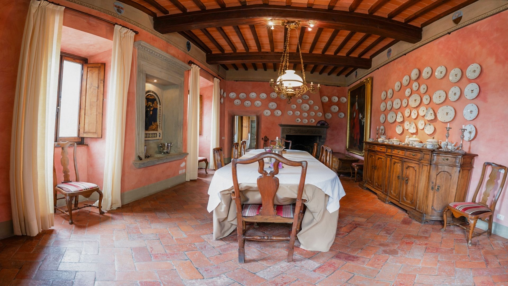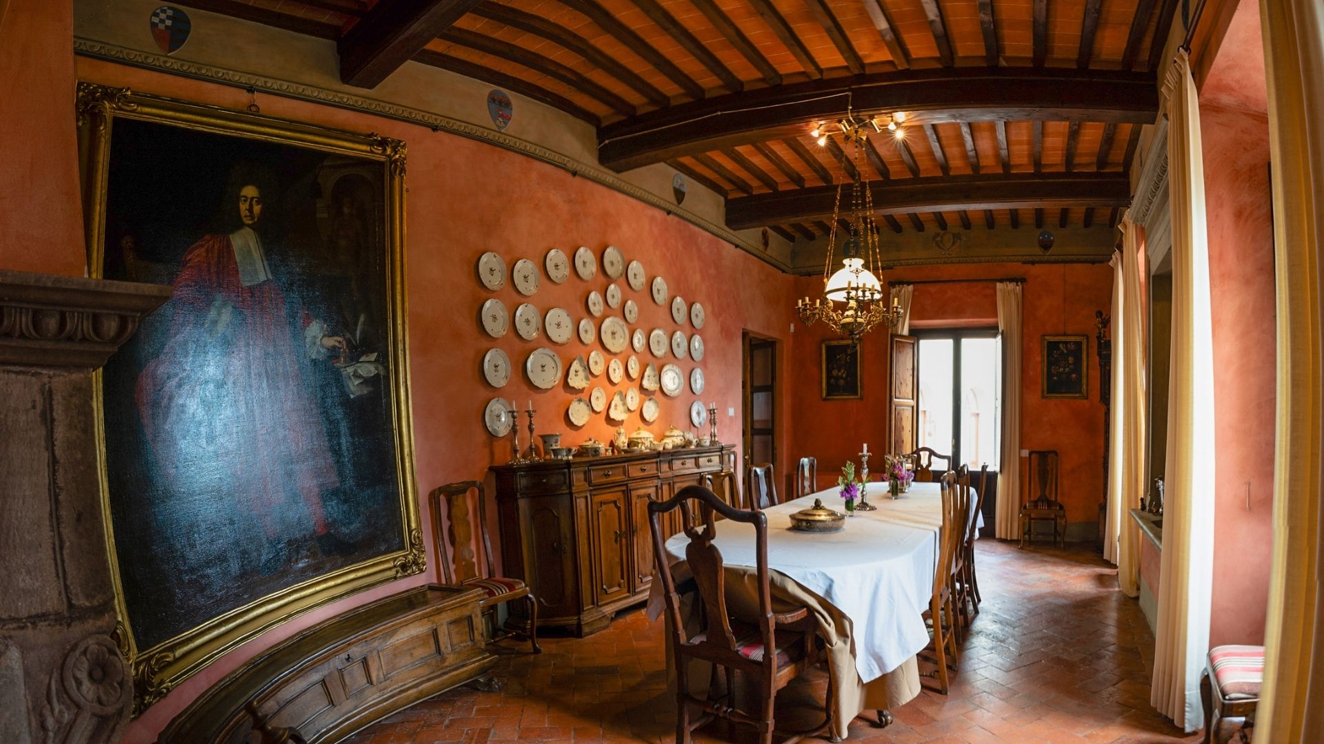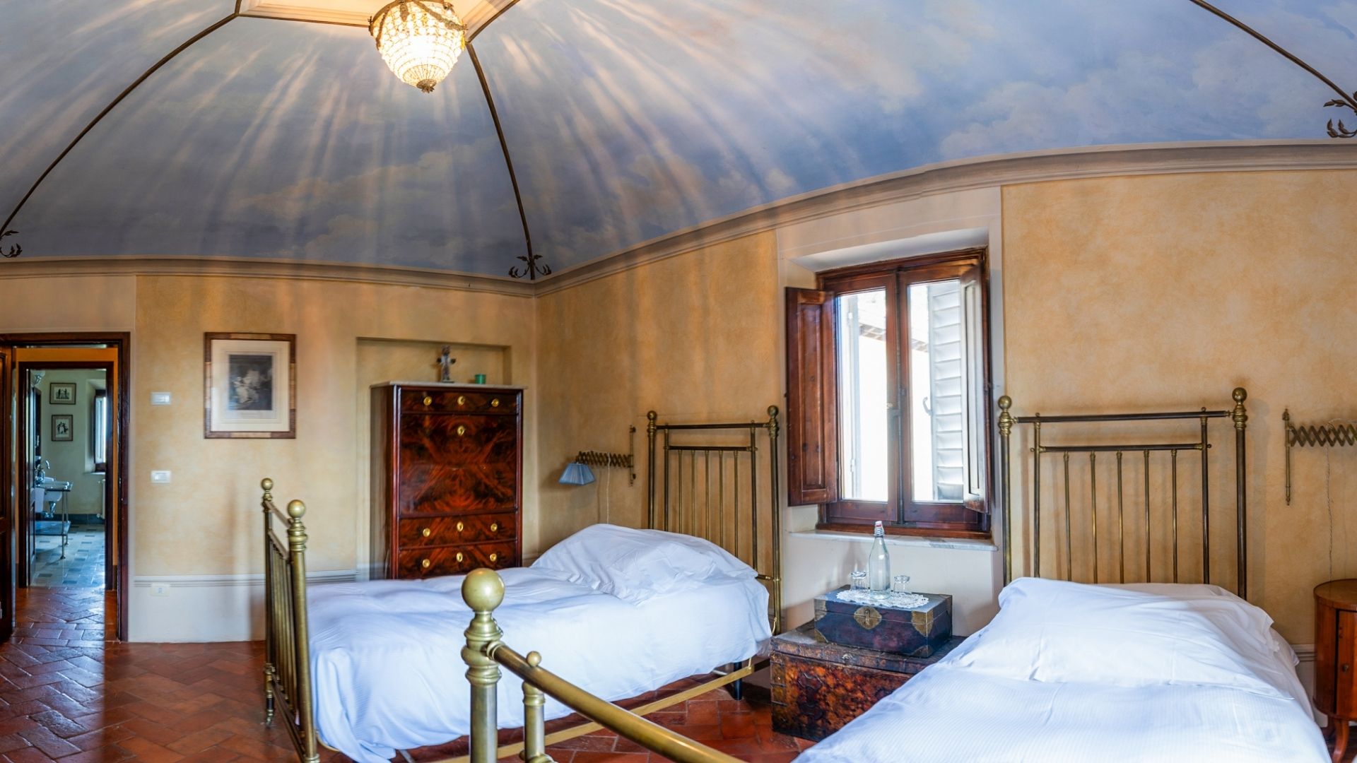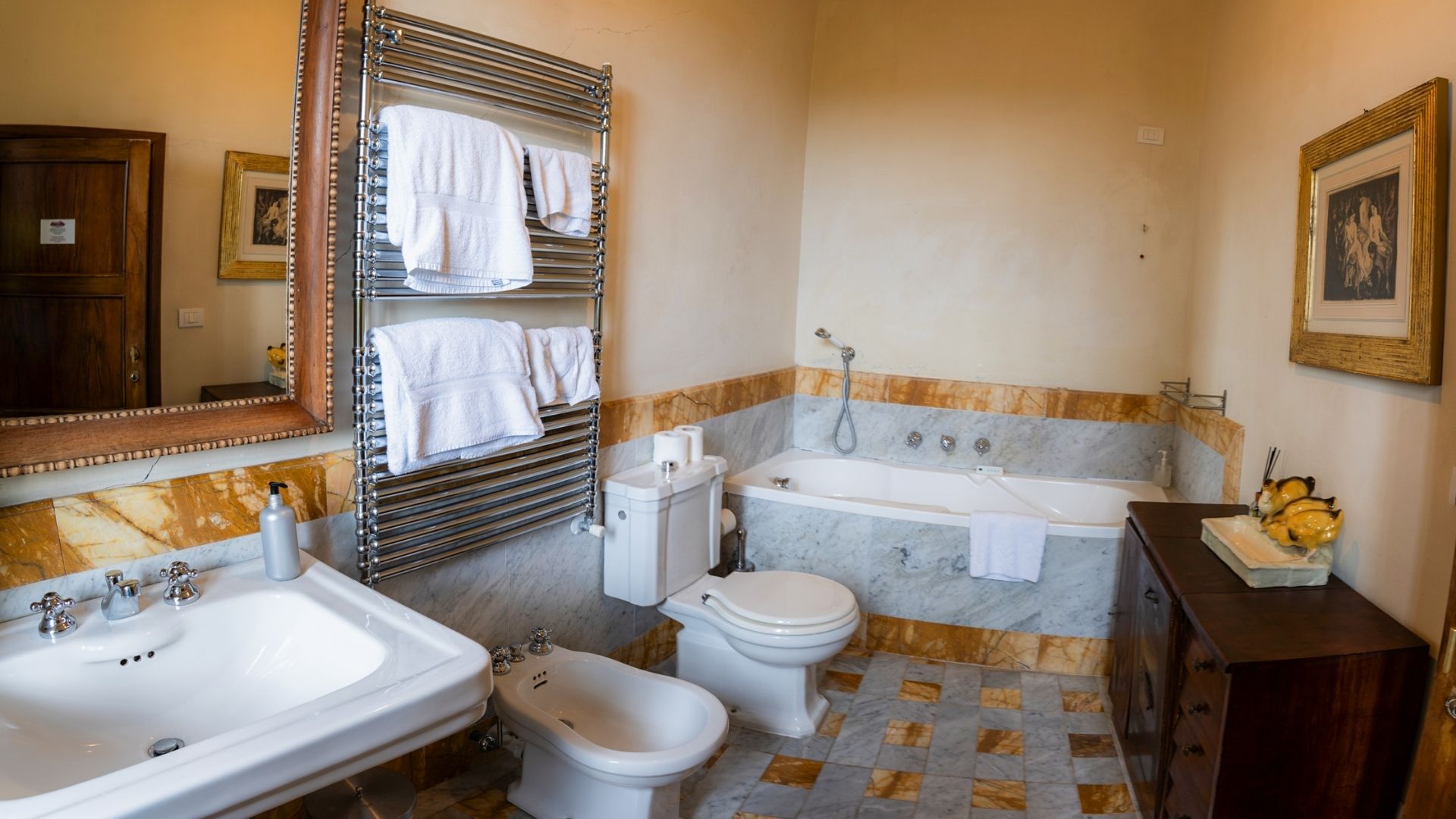 Independent villa for 12 people. On the ground floor, from the main entrance hall you can get to a vast and warm living room with a big fireplace. On the left, a marble staircase leads to the first floor. From the living room, a hallway leads to the rest of the villa. On the left, a big kitchen and completely furnished. Along the hallway, other than a guests bathroom, you can find a luxurious dining room with fireplace, a French window which lead to the courtyard. Going ahead, the Giallo living room with fireplace. On the left, the library with fireplace, a desk with computer, wifi and fax. On the left, the imperial bedroom Federico Barbarossa with ensuite bathroom and Jacuzzi. On the first floor, the marble staircase reach the first floor where you can get to four bedrooms through a long hallway: on the left, the double bedroom Gialla with ensuite bathroom, shower and Jacuzzi. On the left two tin bedrooms, the Azzurra and Rosa bedrooms, both with ensuite bathroom, shower and bath and shower and Jacuzzi. Going further, on the left there is the main double bedroom, Julia, with fireplace, balcony facing the courtyard, ensuite bathroom with shower and Jacuzzi. Going ahead, there is a room with ironing tools, wardrobes and a service staircase which joints Giallo living room. On the XII century tower the entrance is separated from the Villa. On the ground floor there is a living room, on the first floor a double bedroom with fireplace, bathroom. Terrace with a view. On the garden in front of the Villa is possible to view the typical Tuscan landscape: vineyards of the Fattoria and San Gimigano towers. A staircase leads to the inferior bastion through which you can get to the swimming pool (10x5m), surrounded by a garden and in the shade of a loggia. On the rear of it, a shower and a fridge. A lemon grove has been converted into a living room facing the garden, and the terrace offers a great view. A parasol outdoors in front of the lemon grove. There is also a deconsecrated chapel dating from 1210 dedicated to San Bartolomeo and refurbished in the ‘700, the crypt is from the XIII century. There is also a “torchio” for grapes squeezing from 1743 and a wine colletiong available for guests.