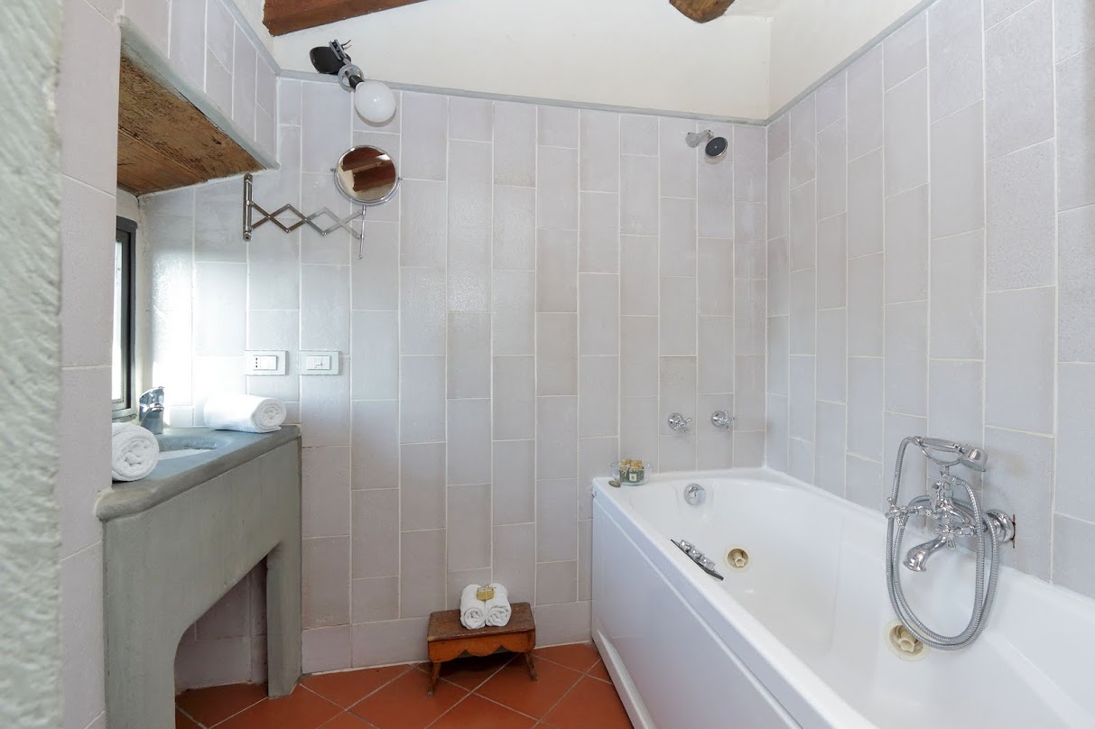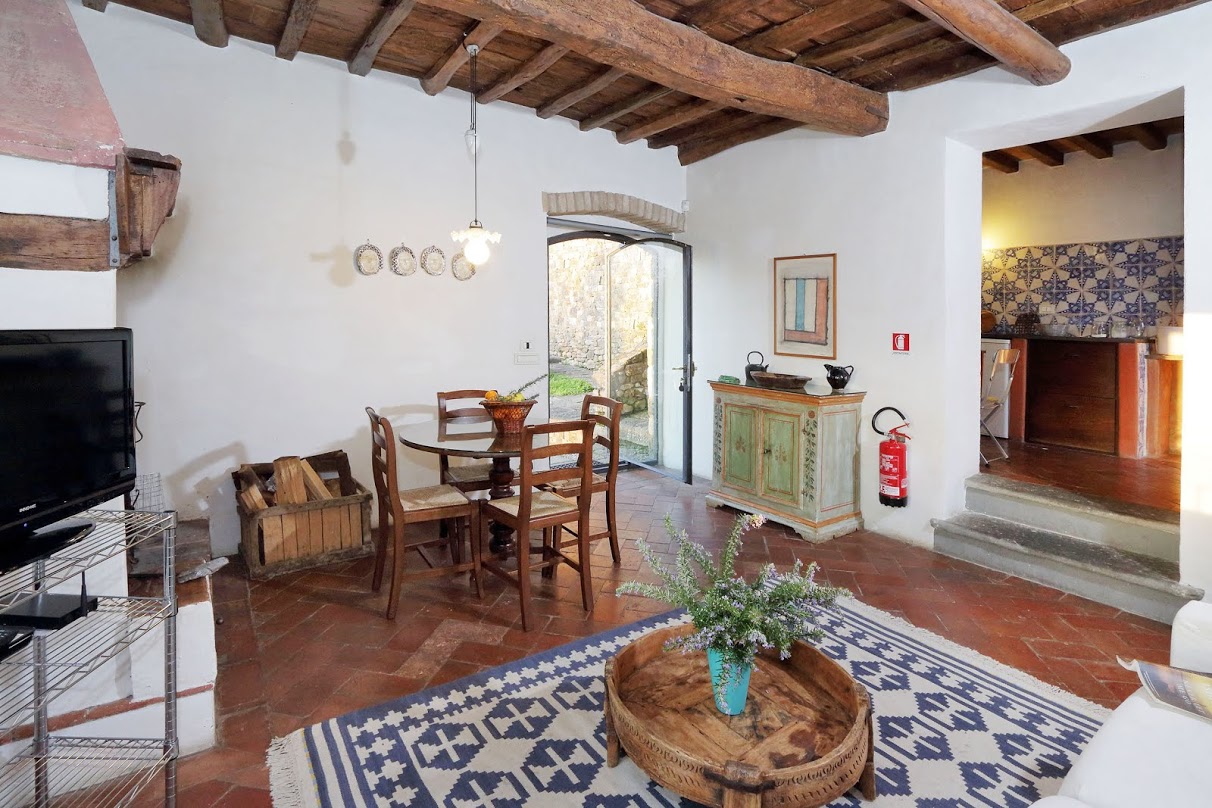 La Canonica (4 +2 beds - 99 sqm) with garden with table and chairs, living room with fireplace and double sofa bed, dining room, kitchen (dishwasher), double bedroom with bathroom with shower, one double bedroom And a bathroom with hot tub.