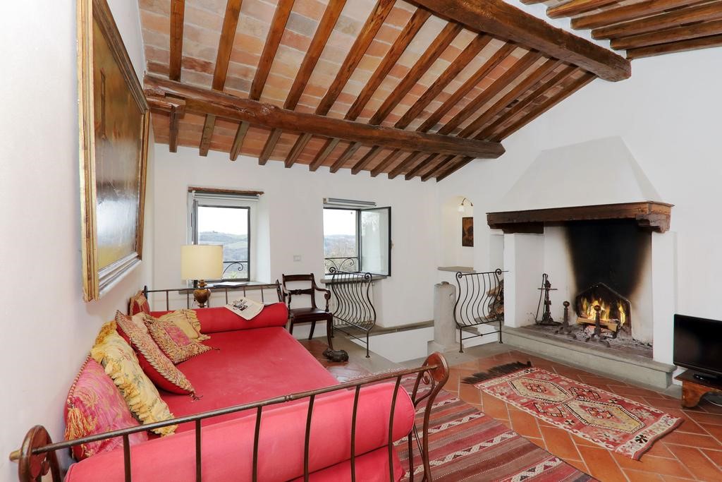 Villa Il Poggio (6 + 2 beds - 300 sqm) on the first floor with living room with fireplace and double sofa bed and television, toilet, a bathroom with shower and washing machine, kitchen (dishwasher), dining room (for 8 People sitting), an outdoor loggia furnished with table and chairs. On the second floor there are two double bedrooms, one twin bedroom, two bathrooms with bathtub and a sitting room. It has a shared swimming pool (5x10 meters), gym and park.