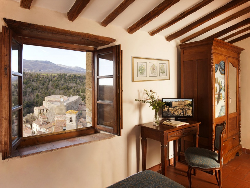 The Superior rooms have a panoramic view over the Etruscan necropolis of San Rocco, the historic village of Sorano or the splendid Piazza Cairoli, the internal courtyard of the Fortress and the museum. All with double bed or the possibility of separate beds, TV, private bathroom with shower, some, the largest, are equipped with an extra bed to become comfortable triple rooms.
