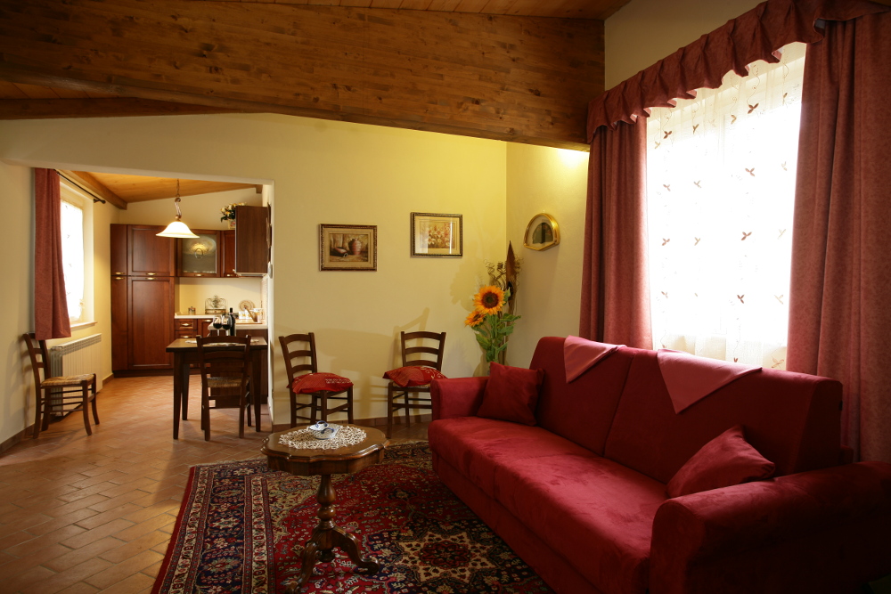 Casina Gelsomino 2 sleeps on the ground floor there are living room with sofa bed, TV, a kitchenette with microwave and dishwasher and a direct access to the loggia and a bathroom with large shower.