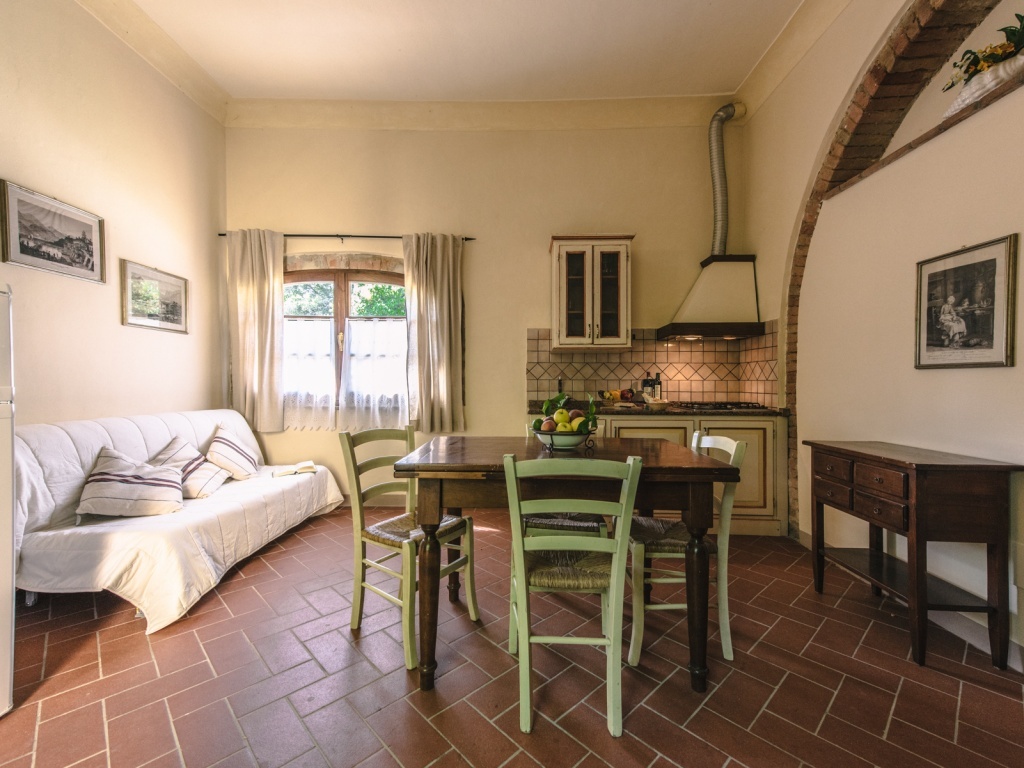 Etruscan apartment, located on the second floor with lift and independent entrance, composed of living room with kitchen and double sofa bed, double bedroom, bedroom with two single beds, bathroom with shower. Spiral staircase that leads onto the private panoramic terrace