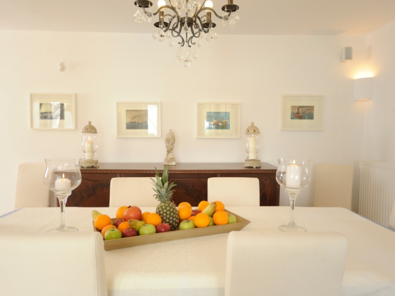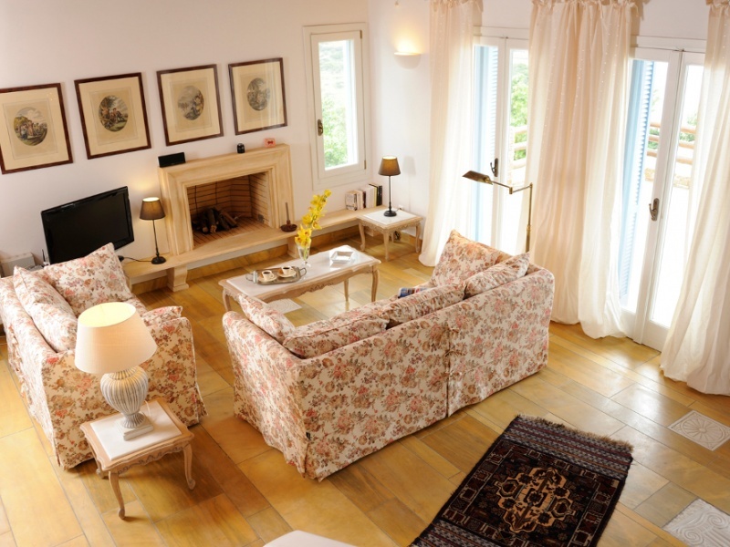 Main living area (about 70 sqm): serves as the main entrance of the villa and includes a large living / dining room with fireplace, a fitted kitchen, a W.C. and a large balcony.