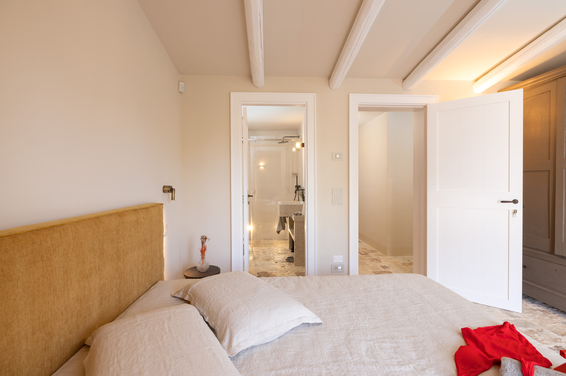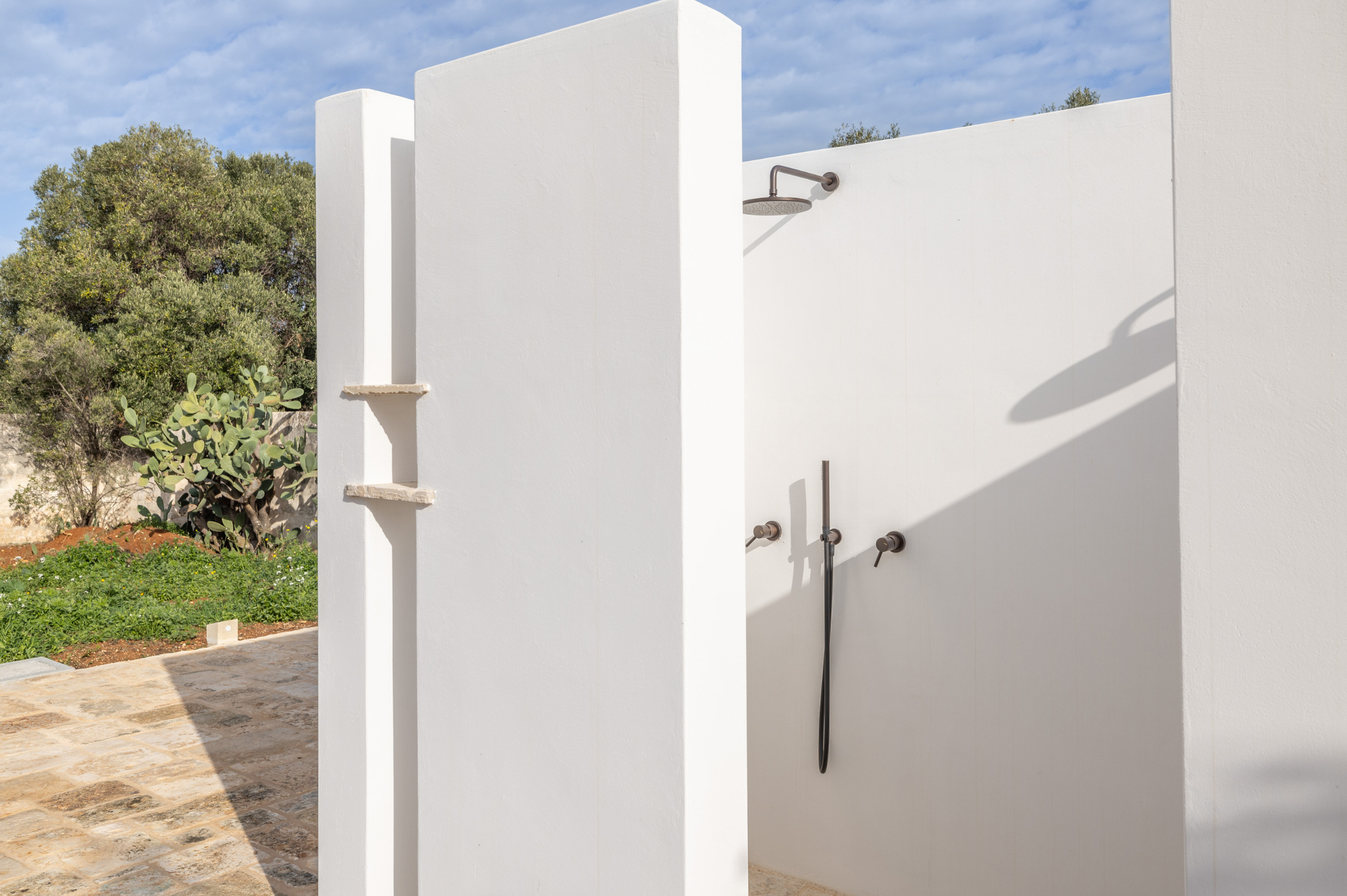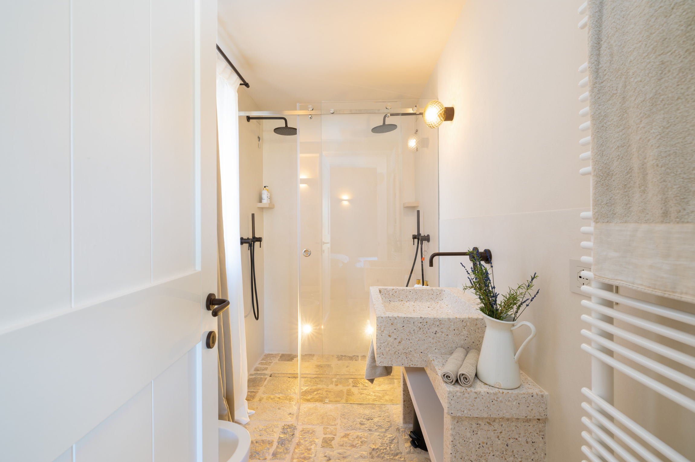 Villa Ostuni can accommodate up to 8 guests across four elegant double bedrooms, each with its own en-suite bathroom, distributed between the ground and first floors. All rooms reflect the refined taste and traditional style that defines the entire property. Upstairs, two double bedrooms feature a minimalist design, enhanced by traditional flooring and whitewashed wooden beams. The master bedroom boasts direct access to the outdoor hot tub—an ideal spot to start the day with panoramic views. The remaining two bedrooms are located on the ground floor and are distinguished by stunning vaulted ceilings, adding a sense of grandeur and space. All rooms are furnished with double beds and en-suite bathrooms, ensuring maximum privacy.