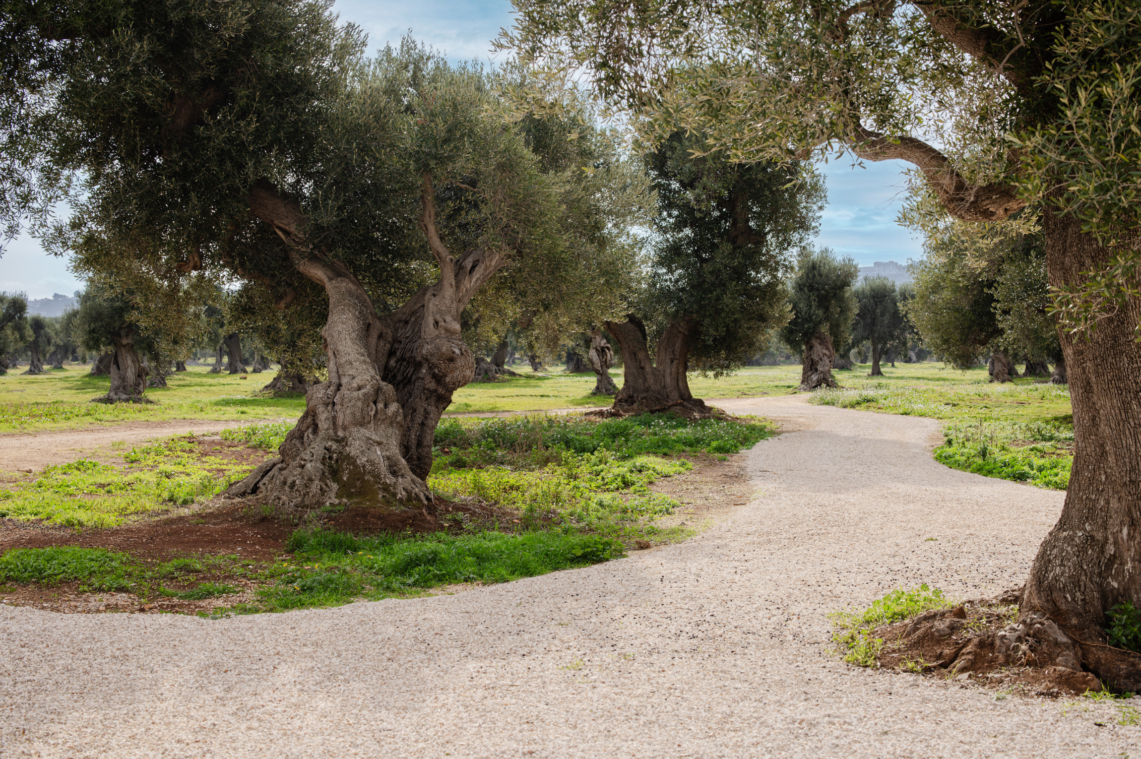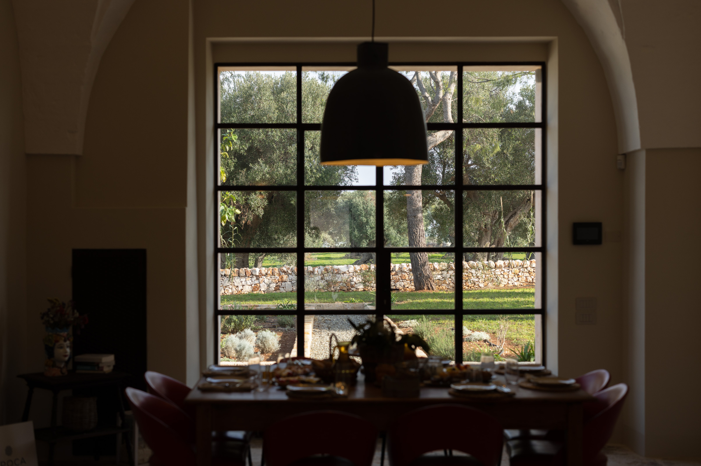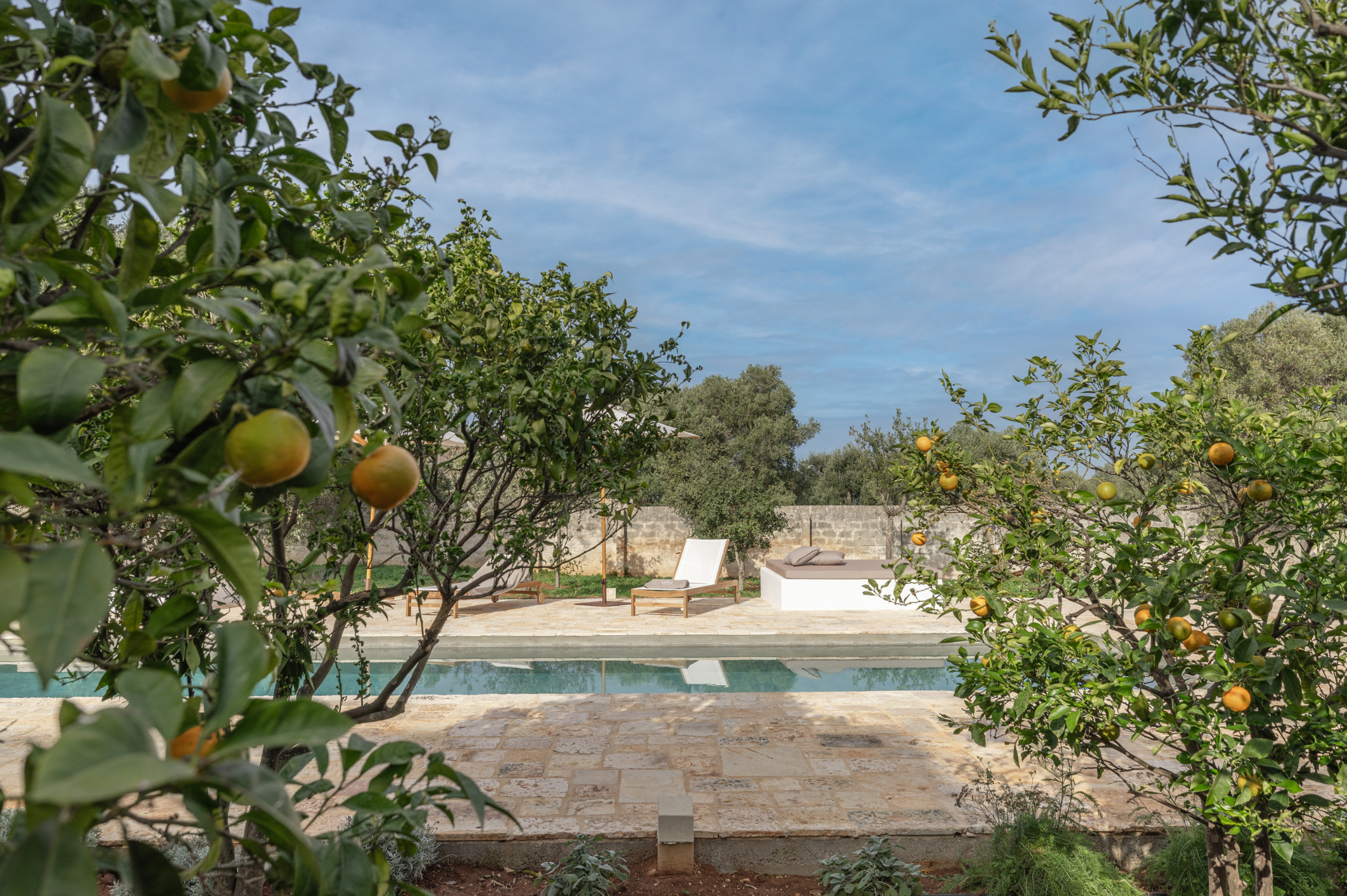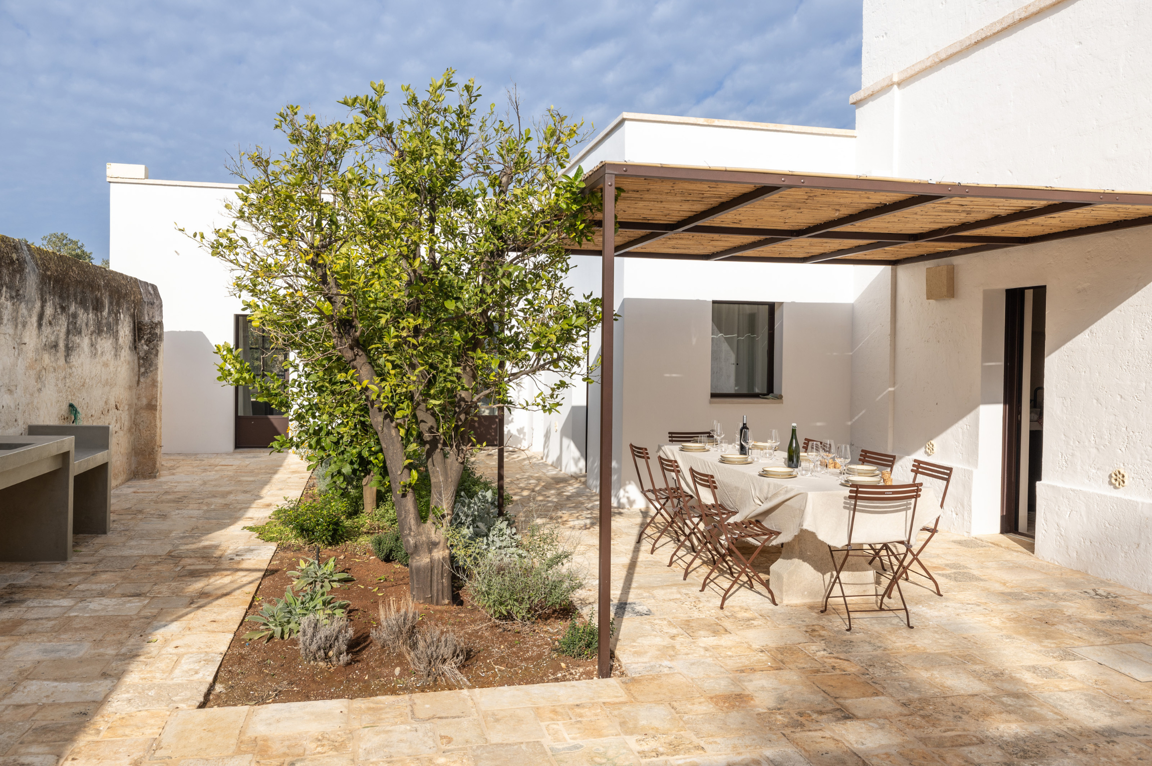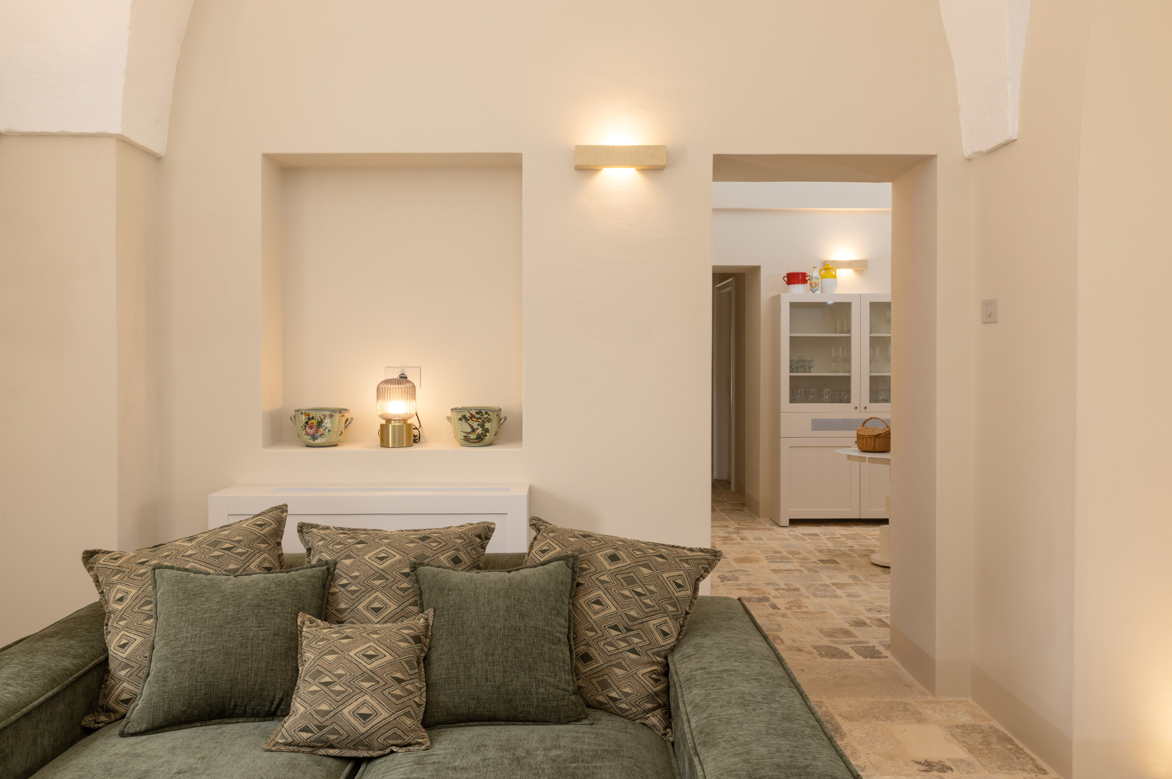 The villa’s outdoor areas evoke the feel of a private oasis, carefully designed to enhance the natural beauty of the Itria Valley. Several terraces overlook the surrounding sea of olive trees. In the inner courtyard, a bamboo pergola shades the outdoor dining area, making it an ideal spot for alfresco meals or traditional barbecues. For those seeking quieter moments, the Mediterranean-style garden—filled with local scents—is perfect for a relaxing stroll.