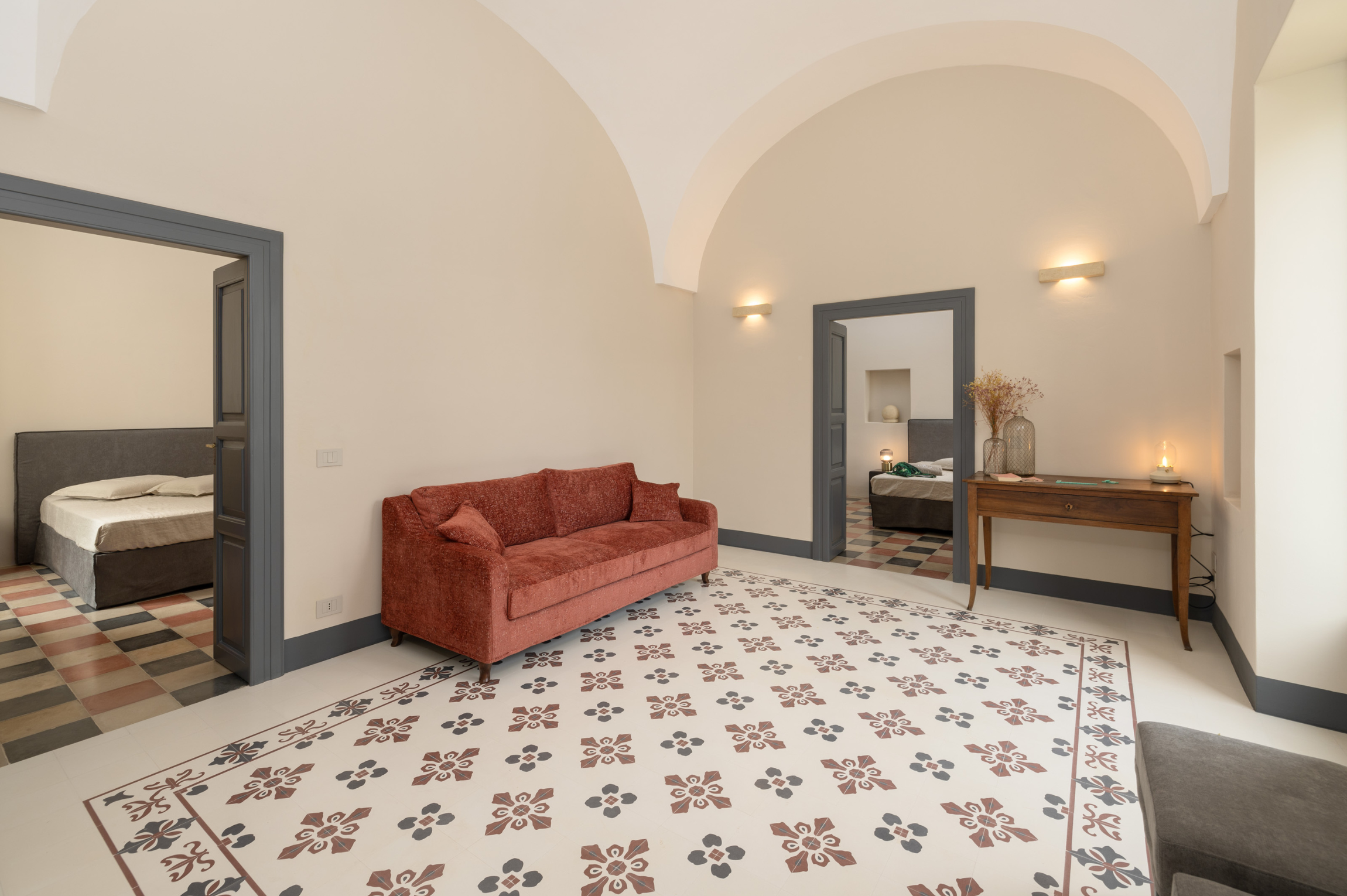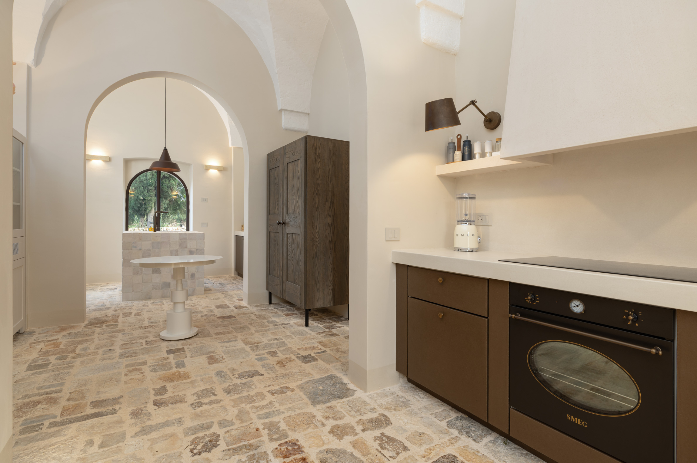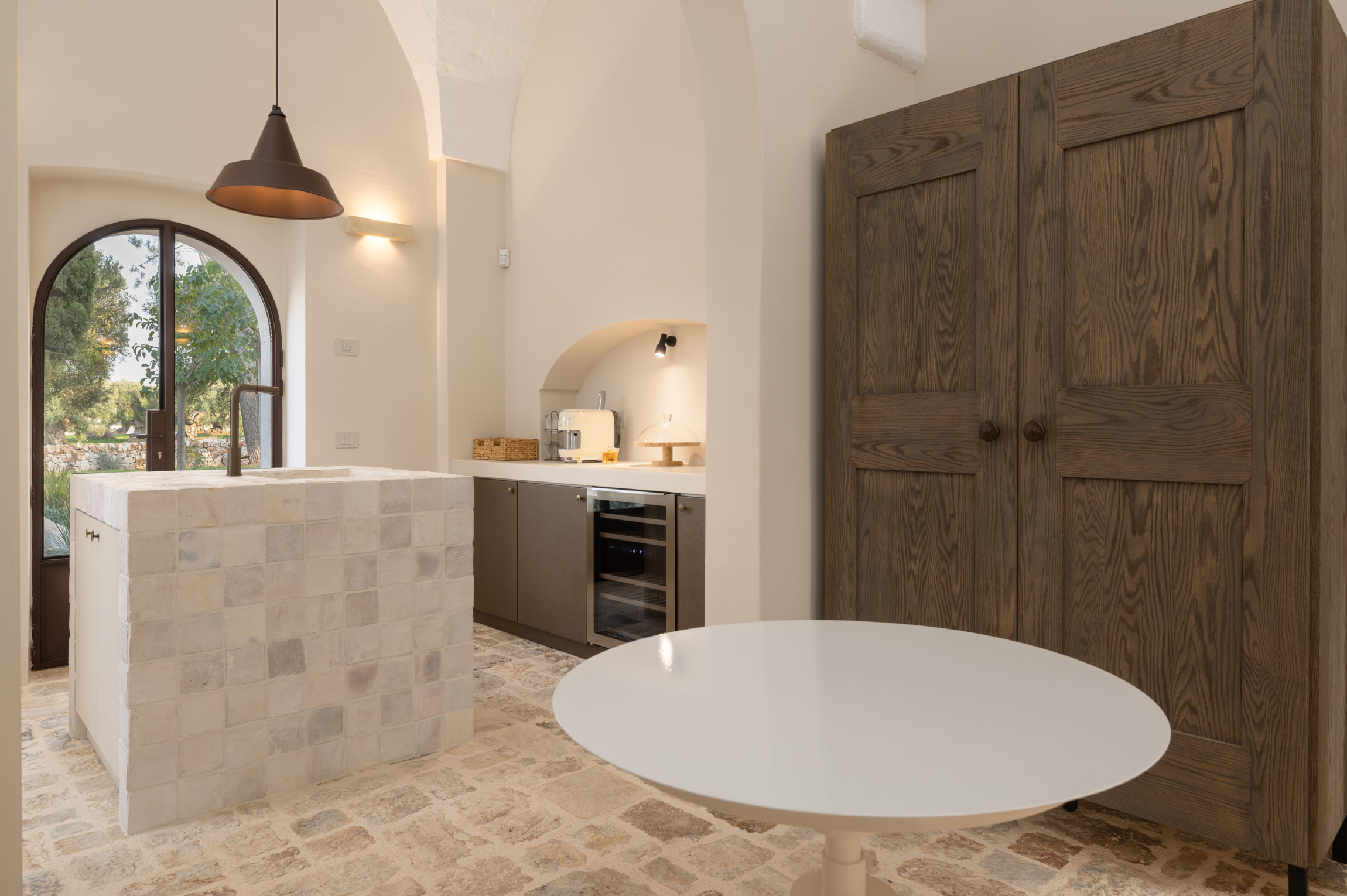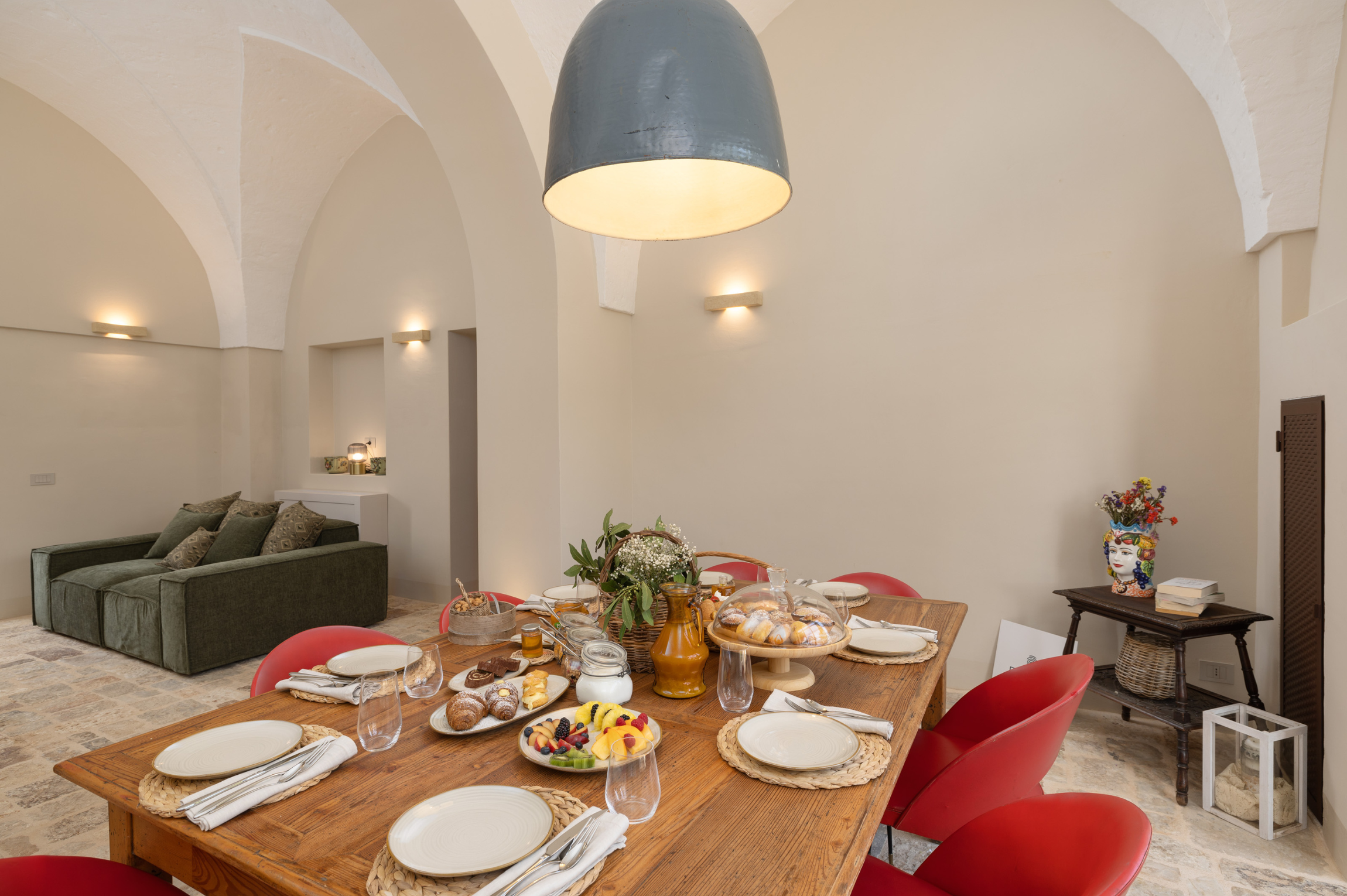 Upon entering the ground floor, guests are welcomed into a spacious open-plan living area. Barrel-vaulted ceilings and traditional stone flooring highlight the authentic Apulian character of the villa, creating a refined yet welcoming atmosphere. A fireplace adds a cosy touch, ideal for cooler evenings. In the same space, a wooden dining table invites guests to enjoy shared meals, while adjacent lies a fully equipped modern kitchen—perfect for preparing Italian-inspired dishes.