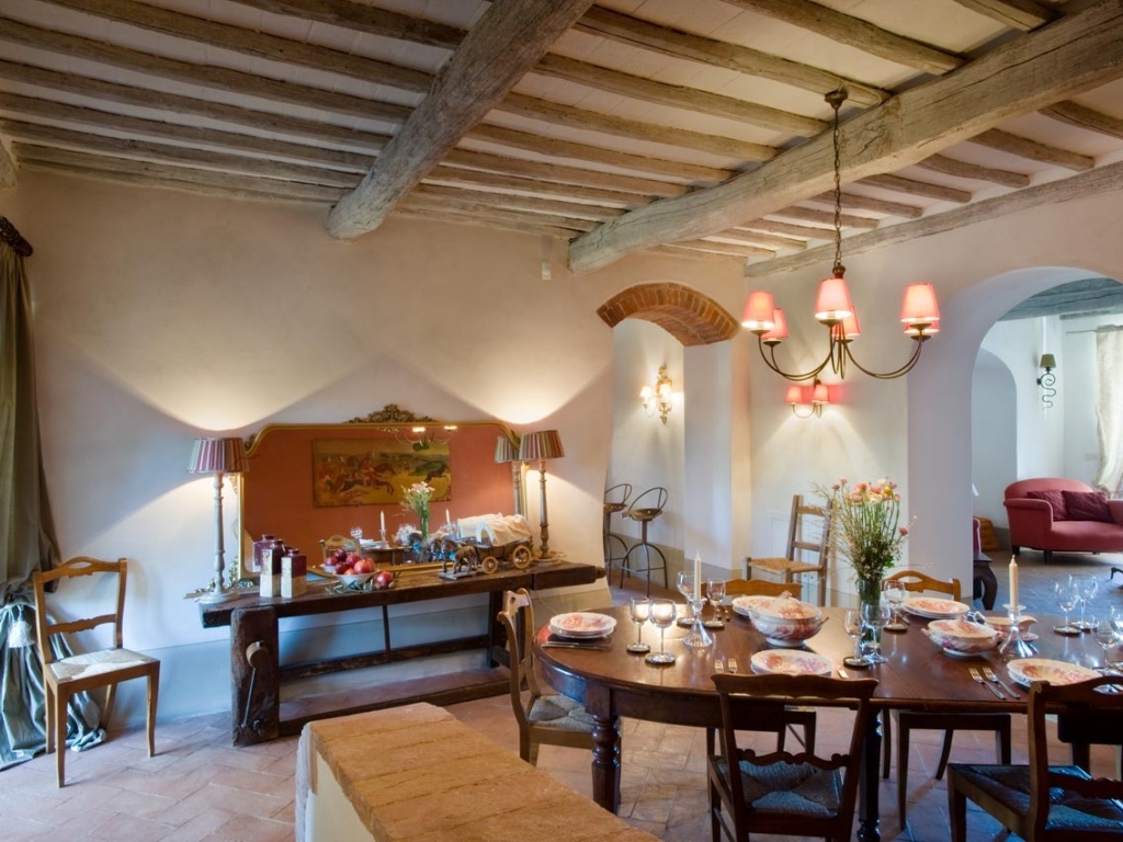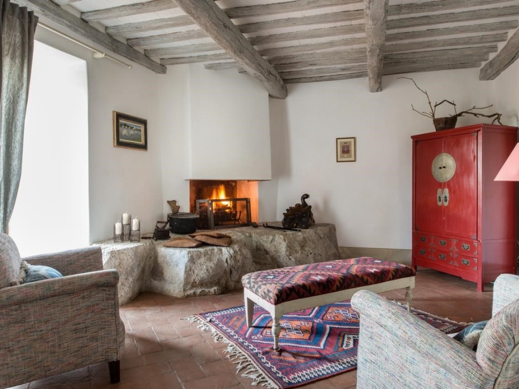 Magnificent stone farmhouse of the seventeenth century completely immersed in the greenery among the beautiful woods of the Sienese mountain. The surrounding area is a rural landscape protected by holm oaks, under which truffles and porcini mushrooms grow, with olive groves and wildflowers. A dirt road flanked by cypresses and oaks leads to the villa. The villa has recently been restored with great care and attention to detail, preserving many of the original features common to Tuscan architecture both externally and internally; the decor is elegant but eclectic, all the rooms have exposed beamed ceilings, lime-washed walls in soft colors and terracotta floors, with some modern Italian shots in the fireplaces, bathrooms and outdoors.