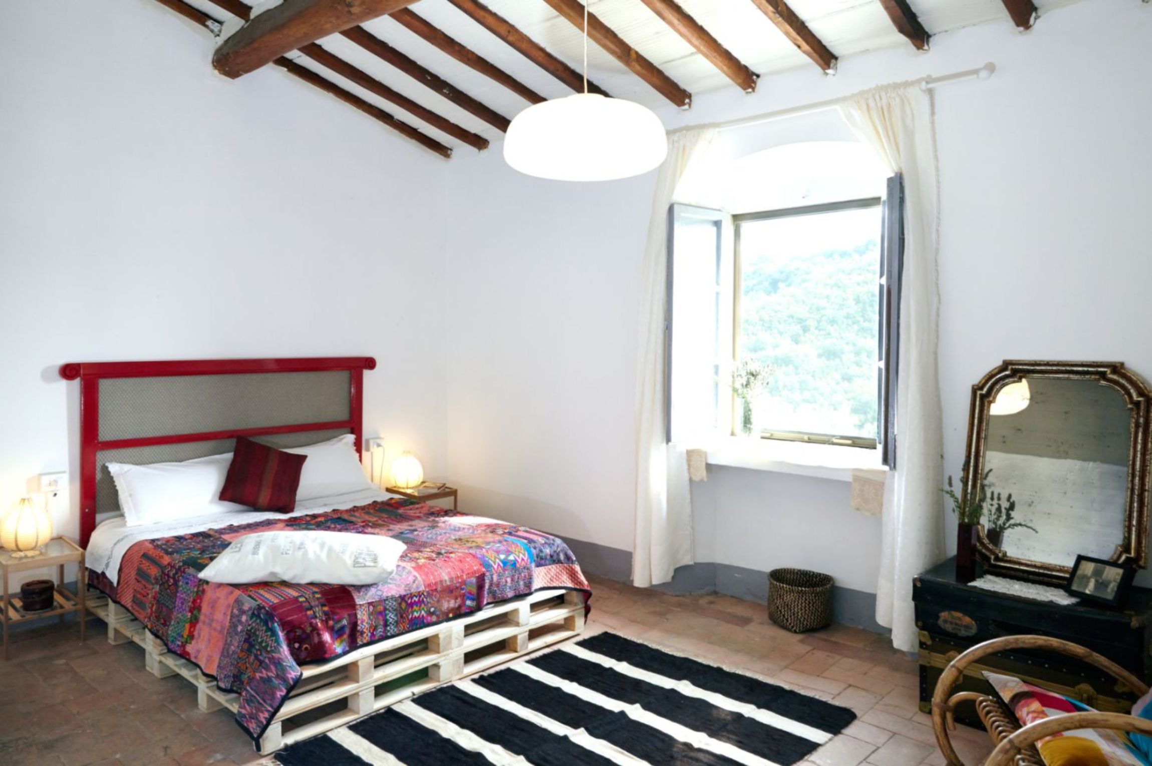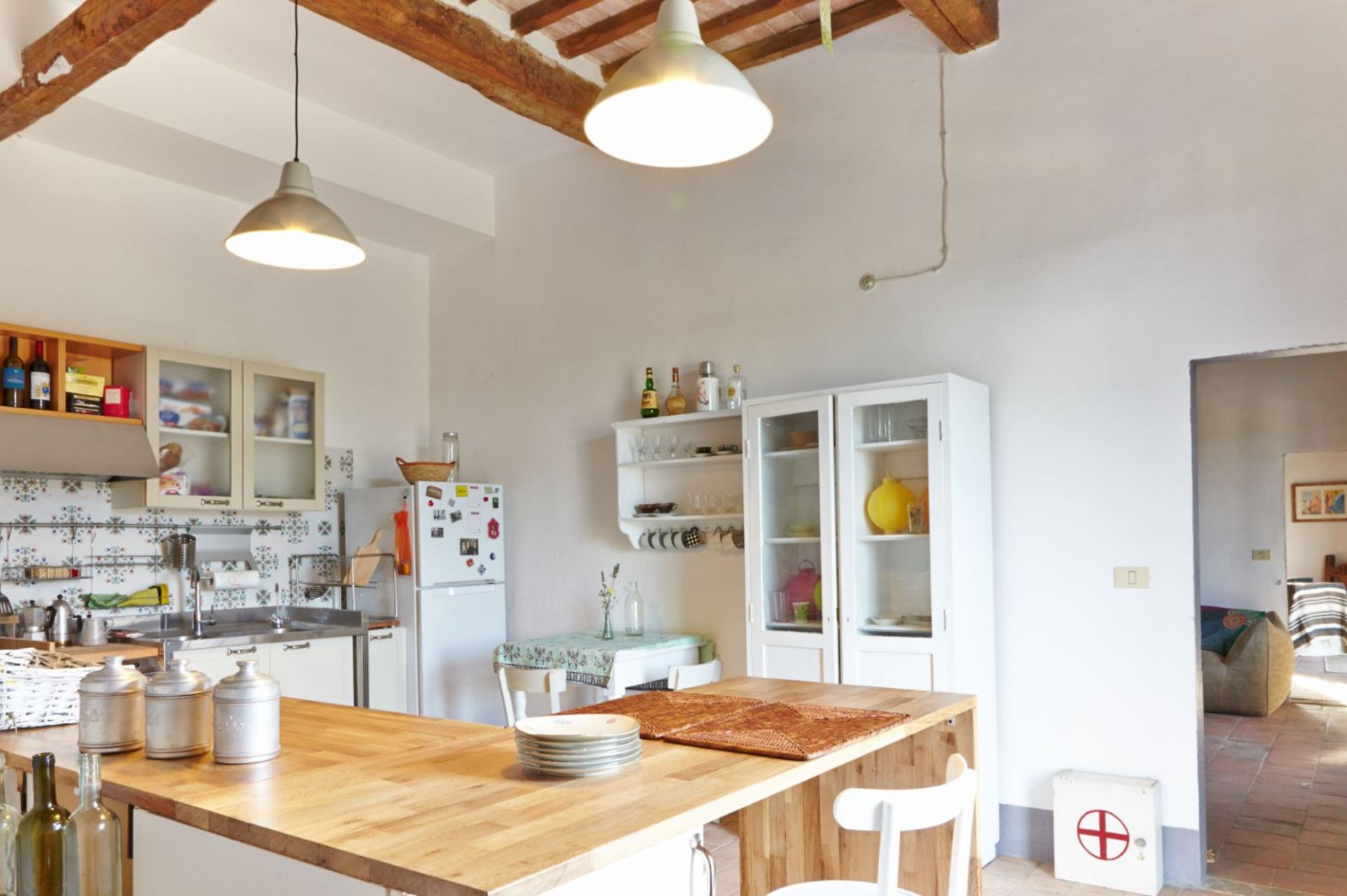 Inside, the villa strikes a perfect balance between tradition and contemporary style. The living room, featuring exposed wooden beams and terracotta floors, is spacious and bright, with large windows overlooking the Tuscan countryside. The living area offers cozy sofas and a reading corner, while the dining room boasts a large wooden table, perfect for convivial gatherings. The modern, fully equipped kitchen, fitted with high-end appliances, is designed to meet every culinary need.