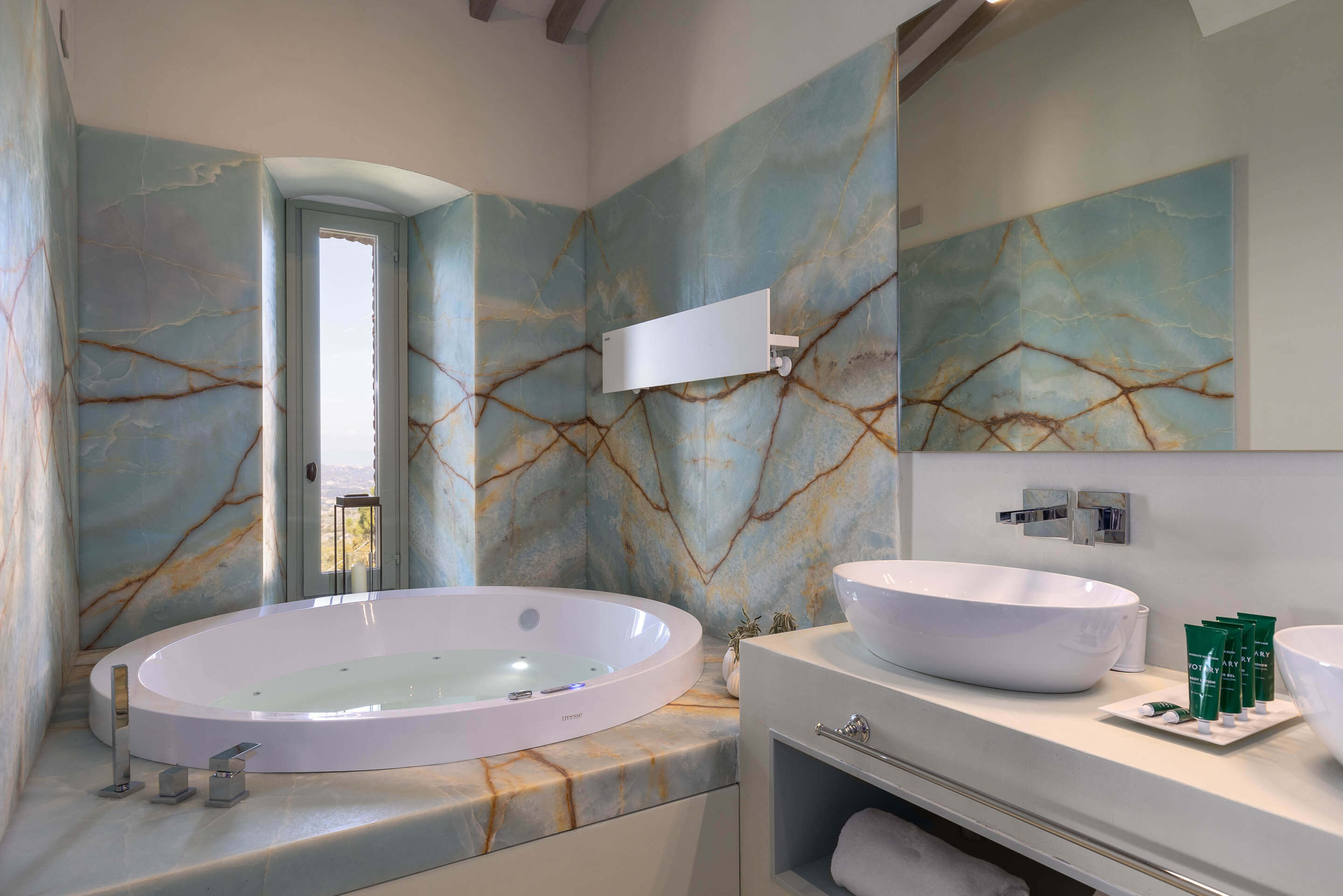 3 Suite (ca 30 mq): Arredate con materiali pregiati e arredi di particolare pregio, sono completamente diverse tra loro: hanno vasca idromassaggio o free standing