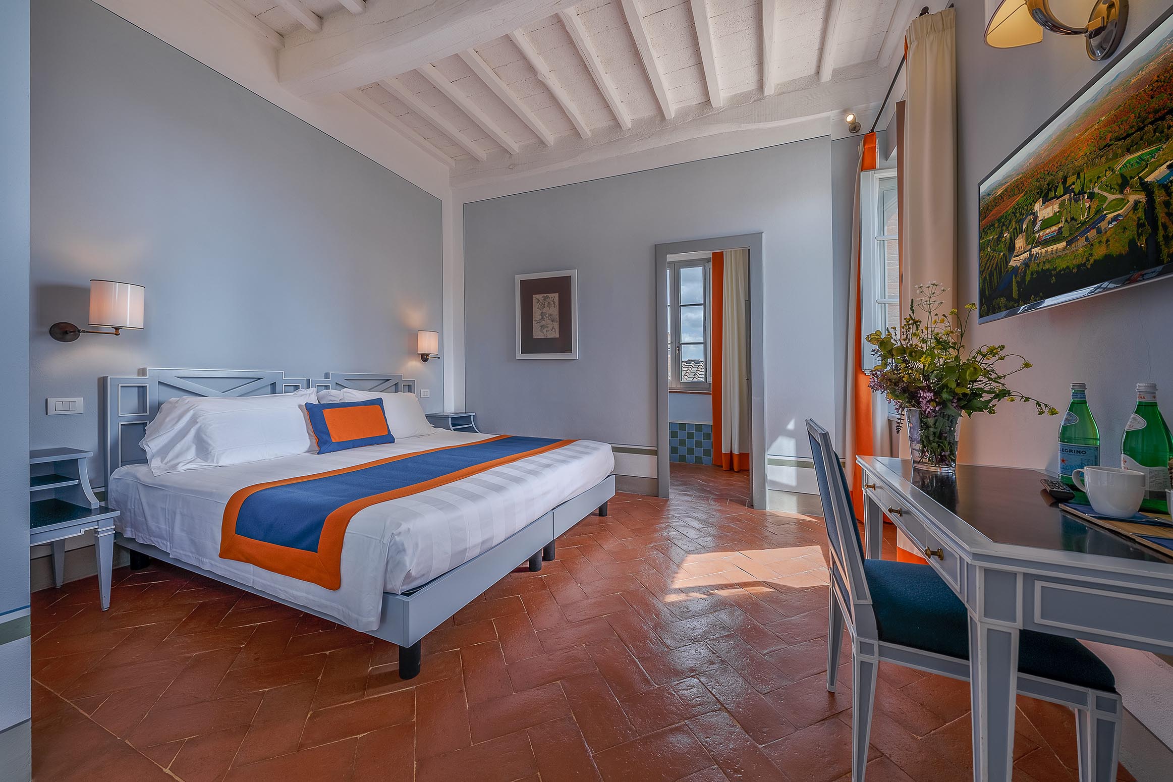 Borgo Scopeto dispone di 52 eleganti camere fornite dei più moderni comfort, senza che il loro fascino trecentesco sia stato in alcun modo alterato.Ogni stanza è dotata di aria condizionata, Tv SAT LCD, collegamento a Internet, cassaforte. Confort assicurato nei bagni rifiniti in marmo e travertino con ampi piani di appoggio, specchio ingranditore, asciugacapelli, vasca o doccia. Le camere sono tutte diverse tra di loro. Alcune hanno un ingresso indipendente e si affacciano direttamente sui nostri giardini. Altre sono godono di una vista stupenda sulla campagna senese, oppure su scorci caratteristici del borgo, dando ai nostri ospiti la sensazione di essere in pieno Medioevo.