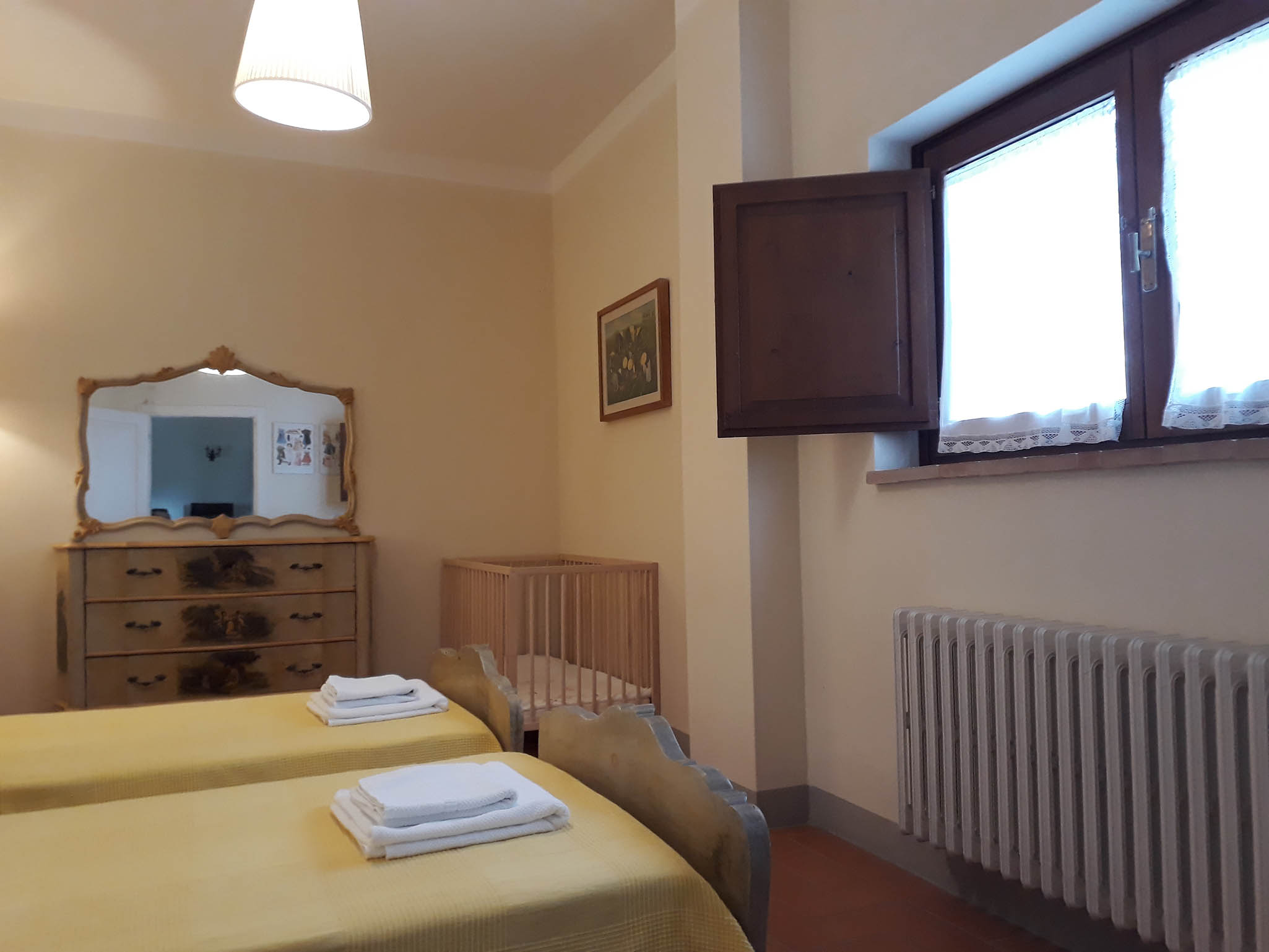All’interno, il Casale di Mucciana offre tre diverse unità abitative, ognuna pensata per garantire il massimo del comfort e della privacy. Gli appartamenti, spaziosi e luminosi, sono arredati con gusto, rispettando la tradizione toscana, ma con tocchi moderni. La cucina, completamente attrezzata, consente agli ospiti di preparare pasti come a casa propria, mentre il soggiorno, accogliente e luminoso, è ideale per momenti di relax in compagnia. Ogni appartamento dispone di camere da letto eleganti e spaziose, dotate di letti comodi e armadi capienti, con finestre che offrono una vista incantevole sul giardino e le colline circostanti. I bagni, ampi e funzionali, sono completi di tutti i servizi, con docce moderne o vasche, arredati con materiali di alta qualità e attenzione ai dettagli, per un’esperienza di agio totale.