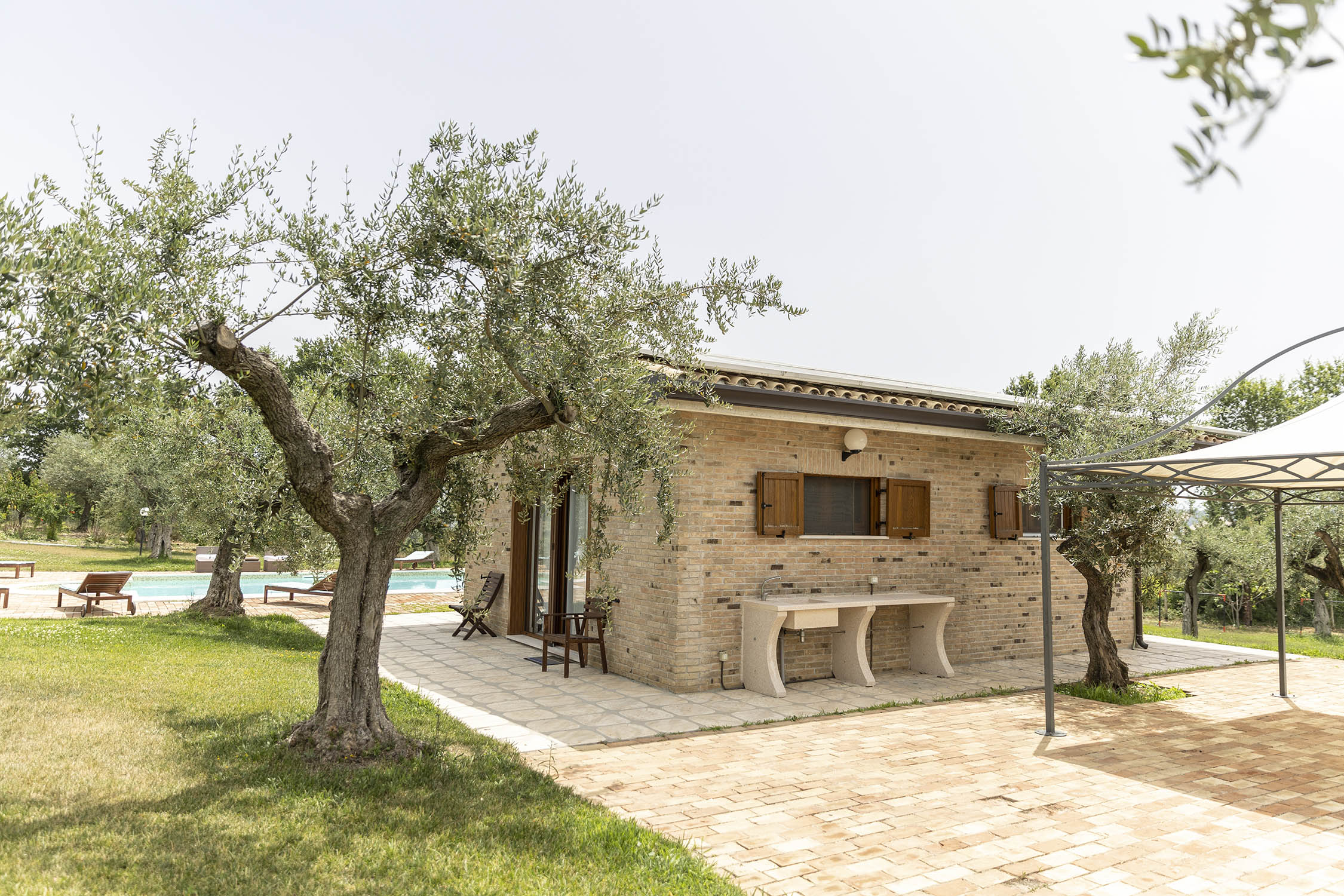L’esterno di Casale Oliva è caratterizzato da un ampio giardino curato, dove gli ospiti possono godere di momenti di relax all’aria aperta. L’agriturismo dispone di una piscina circondata dal verde. Un’area attrezzata con tavoli e sedie invita a pranzi e cene all’aperto, mentre il parcheggio privato garantisce comodità per gli ospiti.