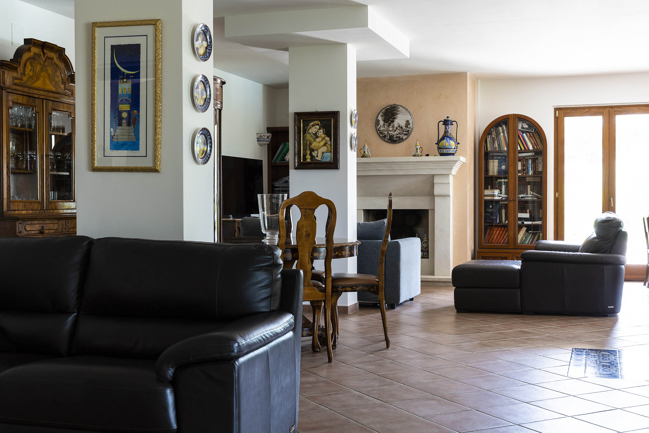 Gli interni di Casale Oliva sono caldi e accoglienti, con un arredamento che richiama lo stile rustico italiano, utilizzando materiali naturali come legno e pietra.