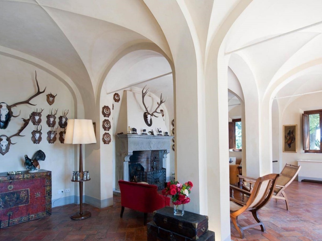 Dall’entrata dell’ingresso principale si accede ad un accogliente e ampio salotto della caccia con un imponente camino. Sulla sinistra una scala in marmo collega al primo piano. Dal salotto un corridoio accede al resto della Villa. Sulla sinistra una cucina spaziosa e completamente attrezzata con “office” per prime colazioni. Lungo il corridoio, oltre un bagno per ospiti si trova la suntuosa sala da pranzo con camino, una porta finestra che accede alla corte. Proseguendo il salotto Giallo con camino. A sinistra la biblioteca con camino, una scrivania con computer, accesso ad internet line ADSL e fax. Sulla sinistra la camera imperiale di Federico Barbarossa ha un bagno ensuite con vasca jacuzzi.
