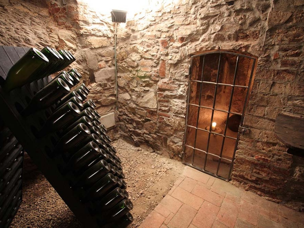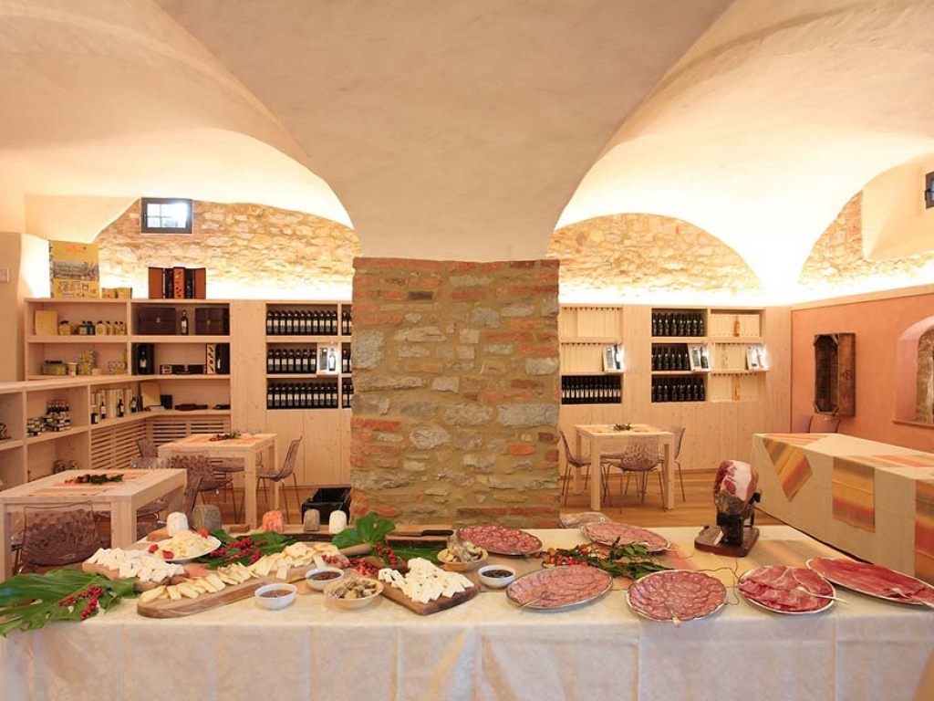 Nei sotterranei del Castello, negli ampi spazi della vecchia cantina, al termine di un percorso anche scavato nella roccia e dopo uno straordinario “passaggio segreto”, si apre l’enoteca: un ampio salone ove degustare, oltre ai vini di Meleto, salumi provenienti dall’allevamento allo stato brado di “Suino Cinto Senese Dop”, olio biologico, miele e specialità tipiche toscane.