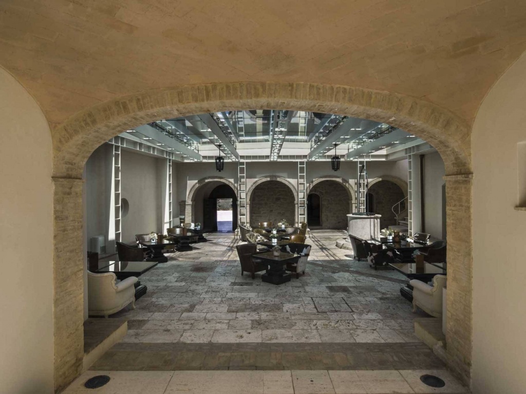 L’antico chiostro del Castello, ora coperto da una cupola di cristallo, è il cuore pulsante della struttura.