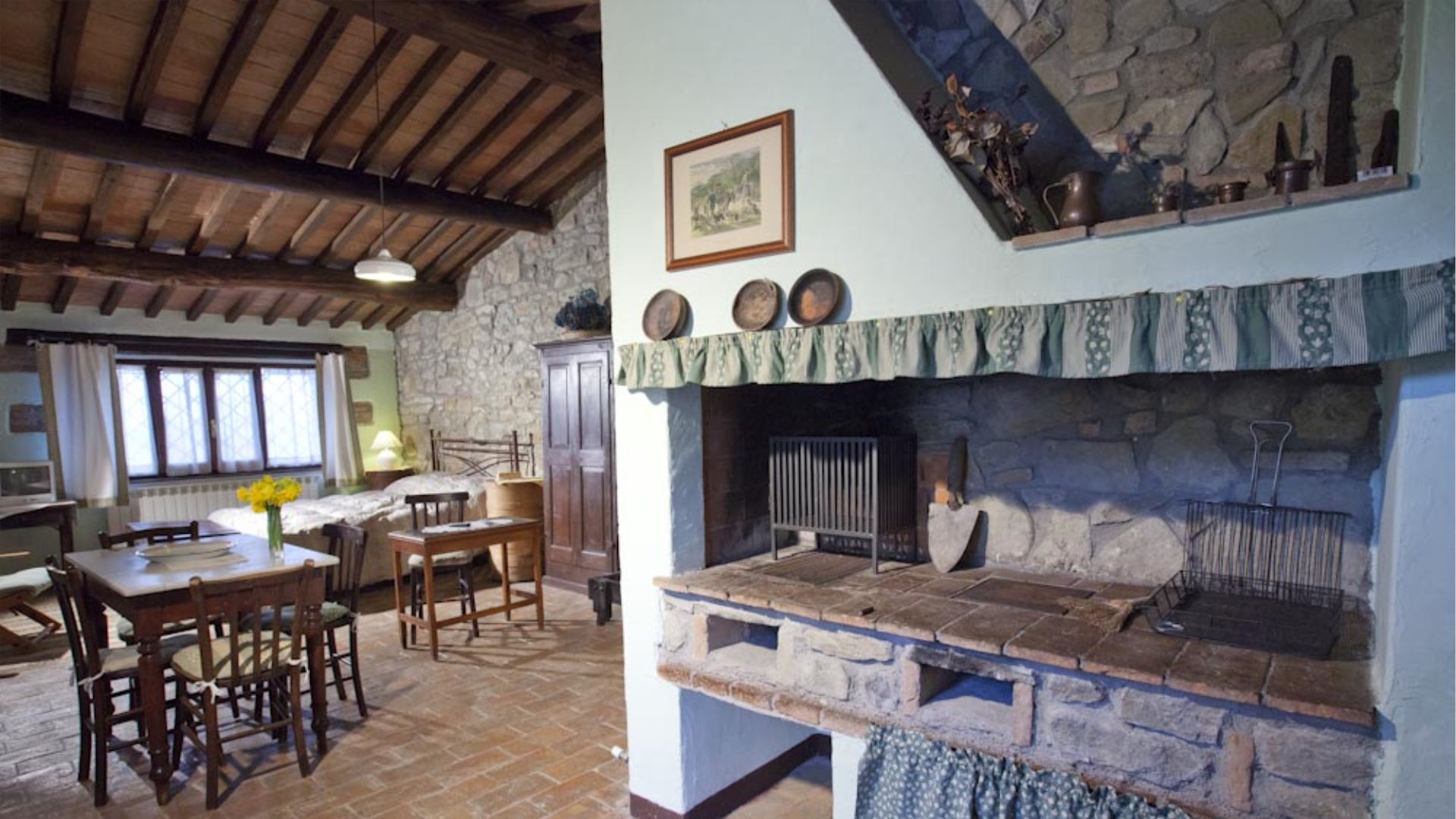 Bucaneve da 2 posti letto monolocale al piano terra composto da angolo cottura con piccolo caminetto e letto matrimoniale, un bagno con doccia.