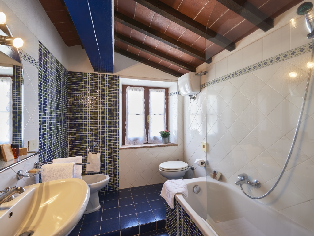 Camera matrimoniale, camera singola, bagno con vasca.