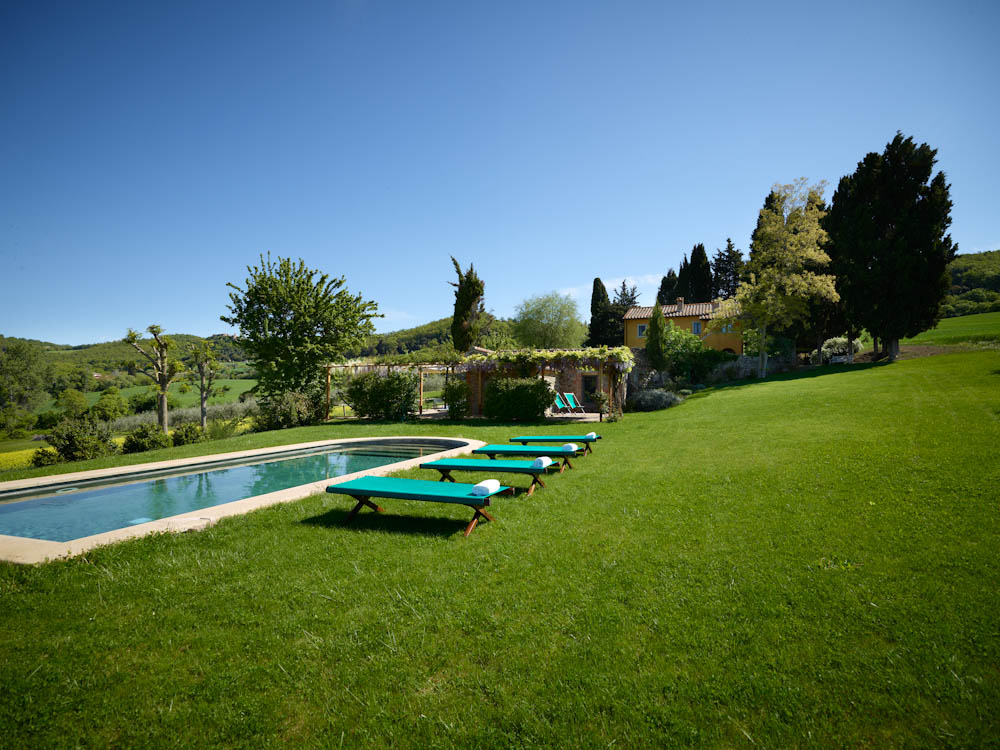A nord la casa è protetta da una fila di cipressi disposti in semicerchio, dove un tavolo di pietra e delle panchine sembrano un invito a consumare i pasti all'aperto. Il giardino, completo di piscina, è stato progettato dall'architetto inglese Peter Curzon. Una pergola corre lungo uno dei lati della casa, accanto alla cucina, e ce n'è un'altra sul terrazzo di fronte alla casetta accanto alla piscina. Fontecipressi abbonda di angoli freschi in cui mangiare, leggere o semplicemente ammirare il panorama.