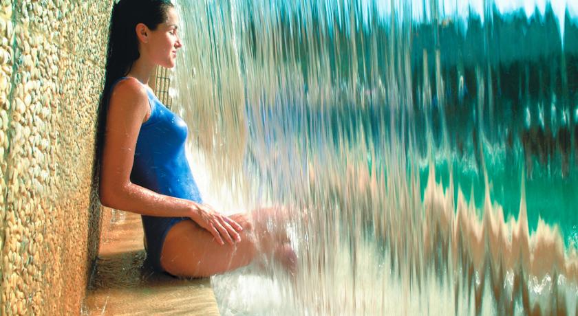 Sette piscine di cui sei con acqua termale, tre interne (due dedicate ai trattamenti ed una in parte esterna ed in parte interna con 22 tipi di idromassaggio diversi e vista sulla valle) e quattro all’aperto (di cui una per gli amici a quattro zampe, una per bambini, una per i clienti dell’hotel ed una per i clienti esterni), piscina esterna a sfioro di acqua fredda di oltre 140mq, centro benessere, spazi meeting dotati di luce naturale, chiesa all’interno del parco dove è possibile celebrare matrimoni, ristorante.