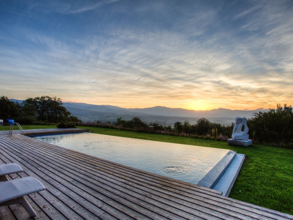 Accesso e posteggio privato, piscina panoramica affacciata sul castello di Poppi e immersa in un parco di piante secolari e fioriture perenni.