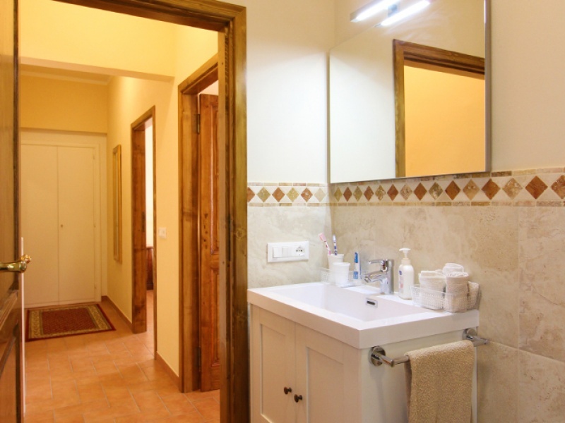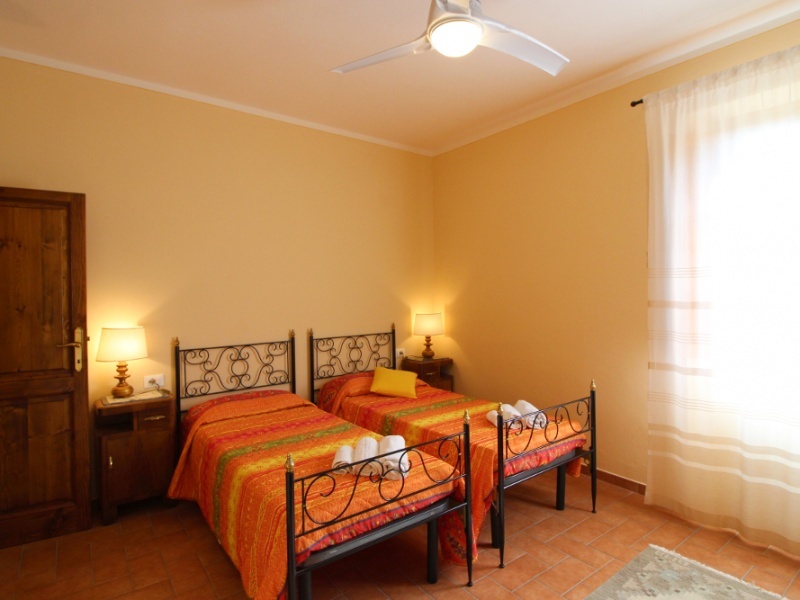 Piano Primo: con accesso esclusivamente da scala esterna con tipica loggetta, si trovano soggiorno-pranzo con TV, cucinotto con forno a legna e con accesso a piccolo resede con tavolo e sedie ideale per colazioni all'aperto. Dal soggiorno si accede al salotto con divani, ampia sala da pranzo, bagno con doccia, camera con 2 letti singoli (singoli standard 0,80x1,90 m), camera matrimoniale (matrimoniale standard 1,60 x 1,90 m) e bagno con doccia. Le stanze sono collegate da alcuni gradini.