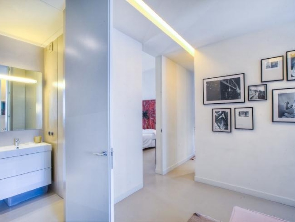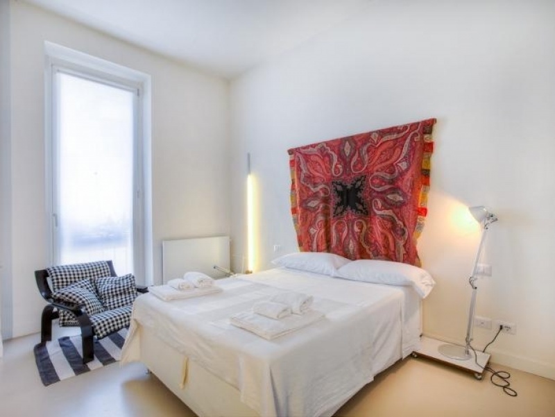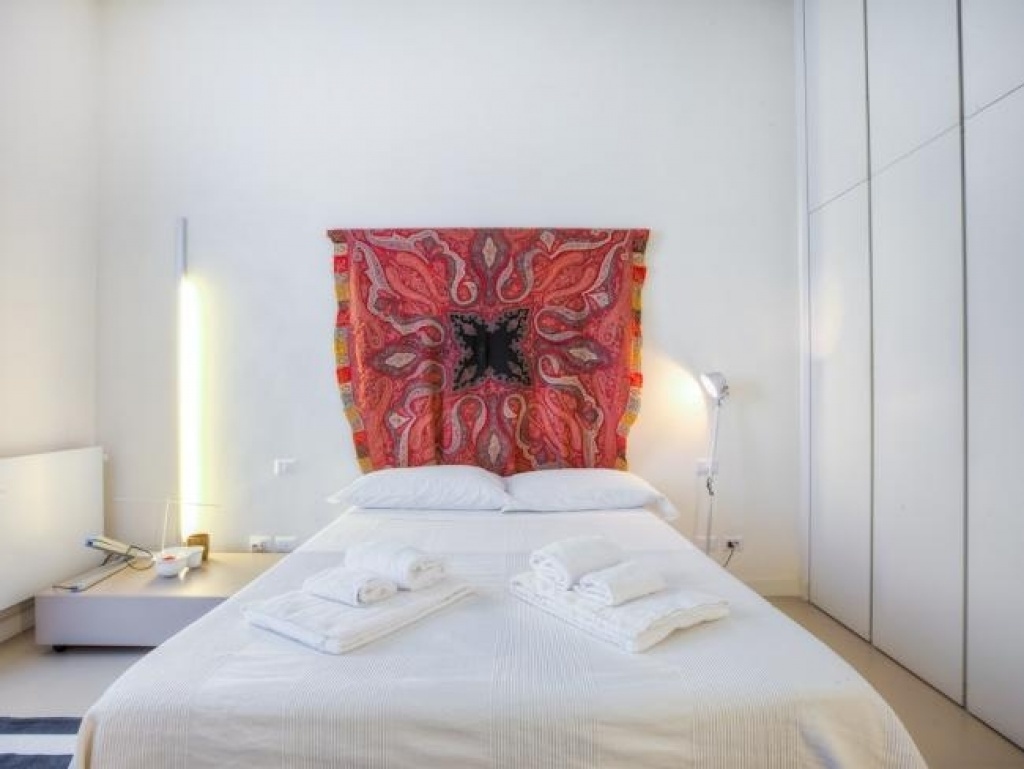 L’appartamento, splendido nel suo design essenziale, si apre su una spaziosa hall da cui si accede ai vari ambienti. Da un lato si trova un grande salone con divano letto matrimoniale e TV; separata da una parete bianca, la sala da pranzo offre un bel tavolo di design in acciaio con sedie, mentre la cucina, fornita di tutto il necessario, si trova in una nicchia proprio accanto, collegata sia alla zona pranzo che al foyer.