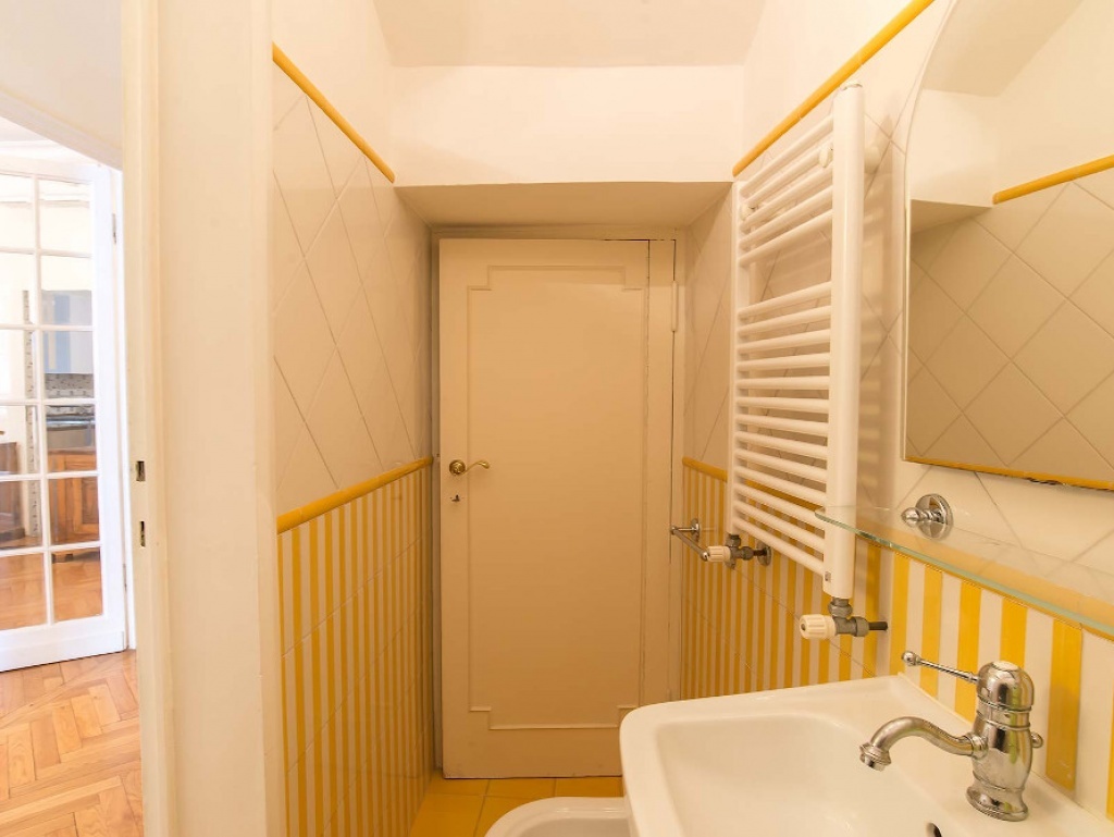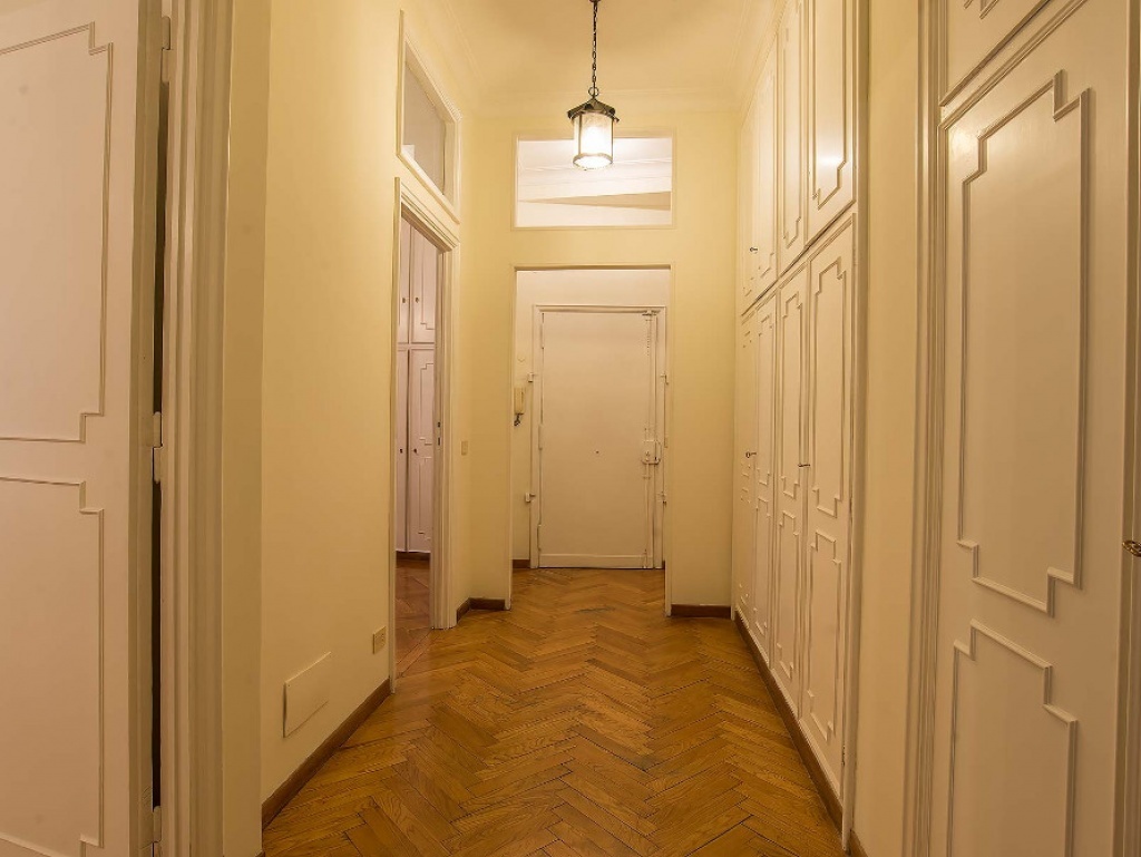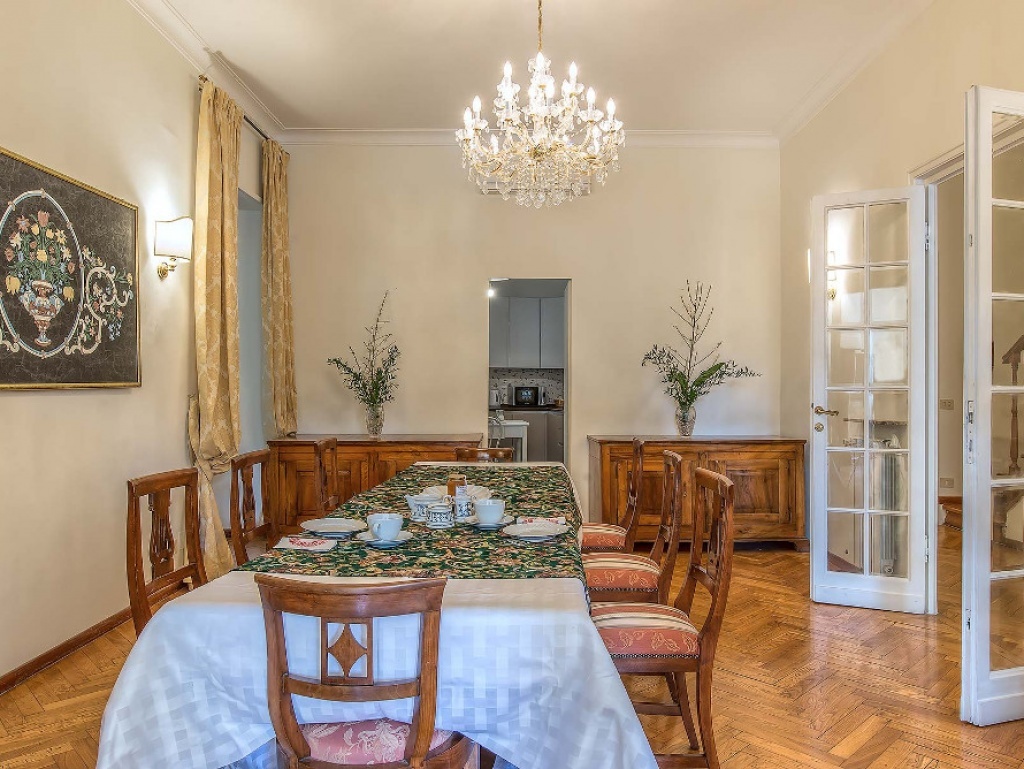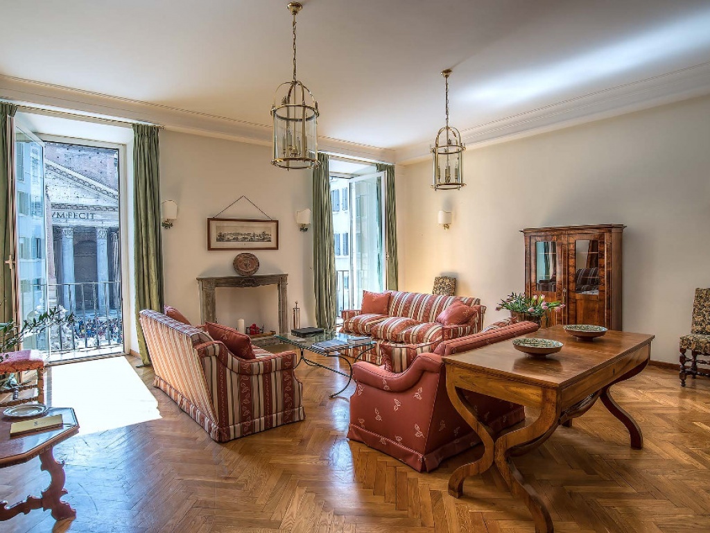 L'appartamento può ospitare 8 persone, al secondo piano, è sviluppato su due piani. L'ingresso conduce alle zone giorno dell'appartamento come un grande salone con due porte finestre che si aprono sul Pantheon, la sala da pranzo per un massimo di 12 persone, una grande cucina, un bagno. Attraverso una grande scala si raggiunge il piano superiore per andare alle 4 camere da letto (3 matrimoniali e 1 doppia), ognuna con il proprio bagno. Due delle quattro camere si affacciano sulla facciata del Pantheon.