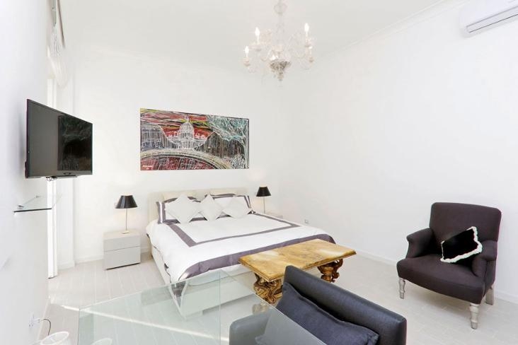 - una camera da letto matrimoniale (160 cm x 190 cm) affacciata su Via della Vite, che offre un angolo studio con scrivania ed una piccola zona relax con poltrona, televisione ed armadio a muro;