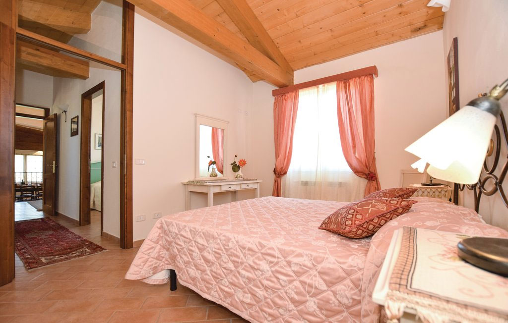 Casina Rosa da 4 posti letto: grande sala con divano letto matrimoniale, tv e uscita sulla loggia esterna, una cucina grande con uscita su loggia esterna con forno e lavastoviglie, un bagno con doccia. Al primo piano una camera matrimoniale, una camera doppia, un bagno con vasca.