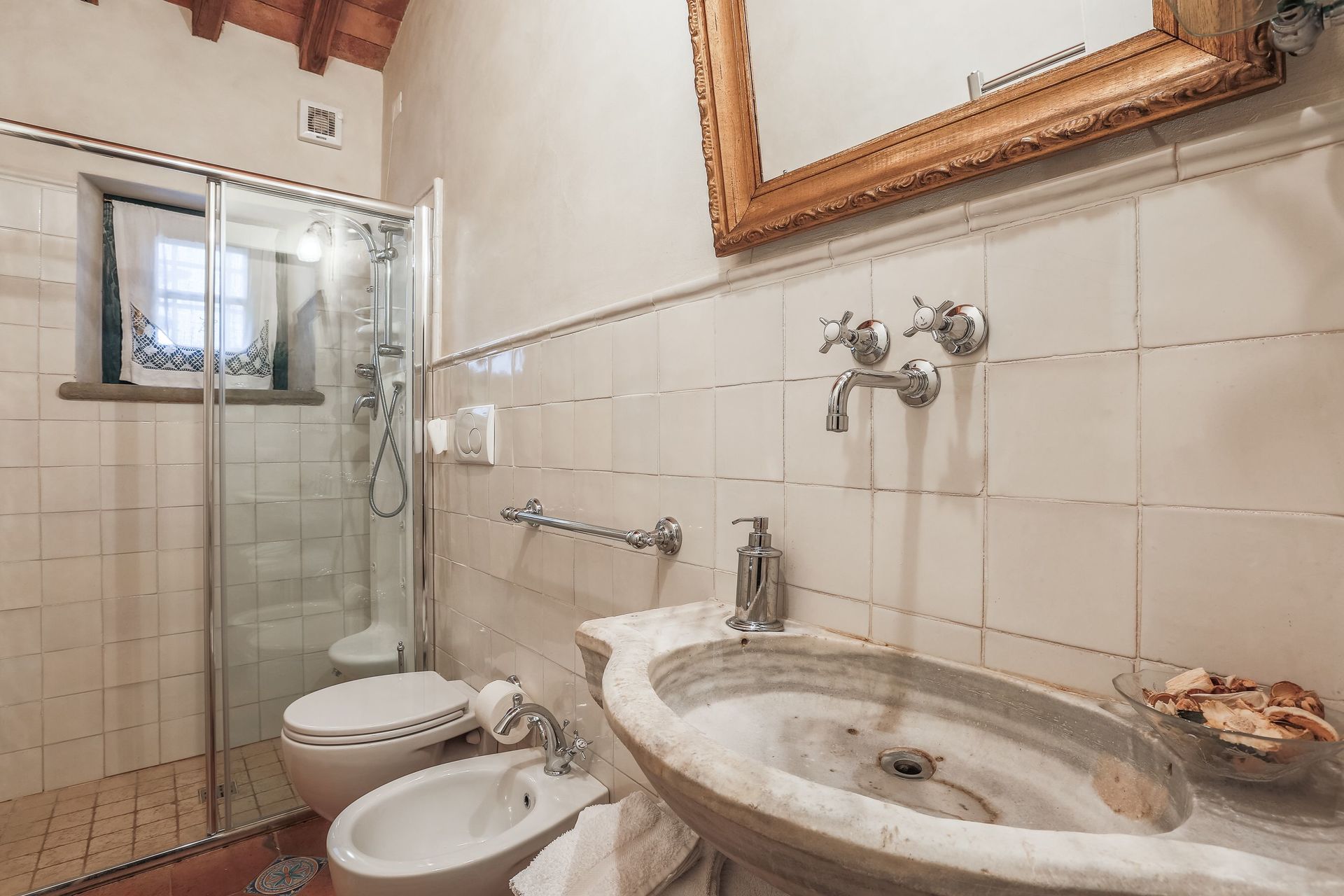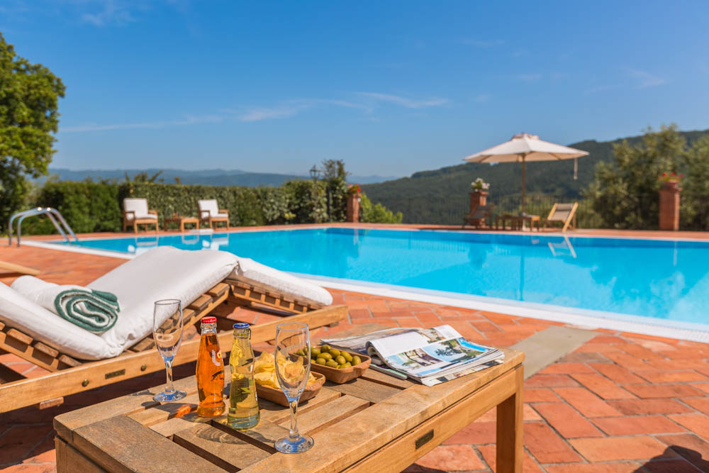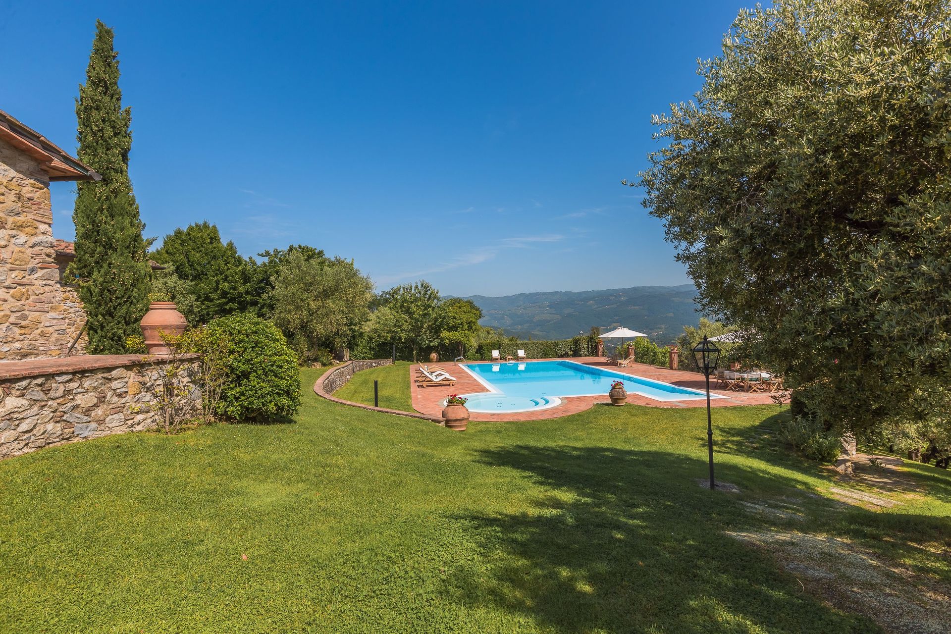 Al piano terra ingresso, salotto con divano letto matrimoniale, salone con caminetto, cucina con due forni, caminetto ed accesso alla veranda con tavolo per 14 persone dove è possibile mangiare all’aperto, una camera matrimoniale con caminetto che conduce alla veranda con vista sulla piscina, un bagno con doccia idromassaggio, lavanderia con lavatrice. Al primo piano una camera matrimoniale con bagno con doccia idromassaggio, una camera matrimoniale con bagno con doccia e vasca idromassaggio, una camera doppia (che condivide il bagno con una delle due camere matrimoniali).