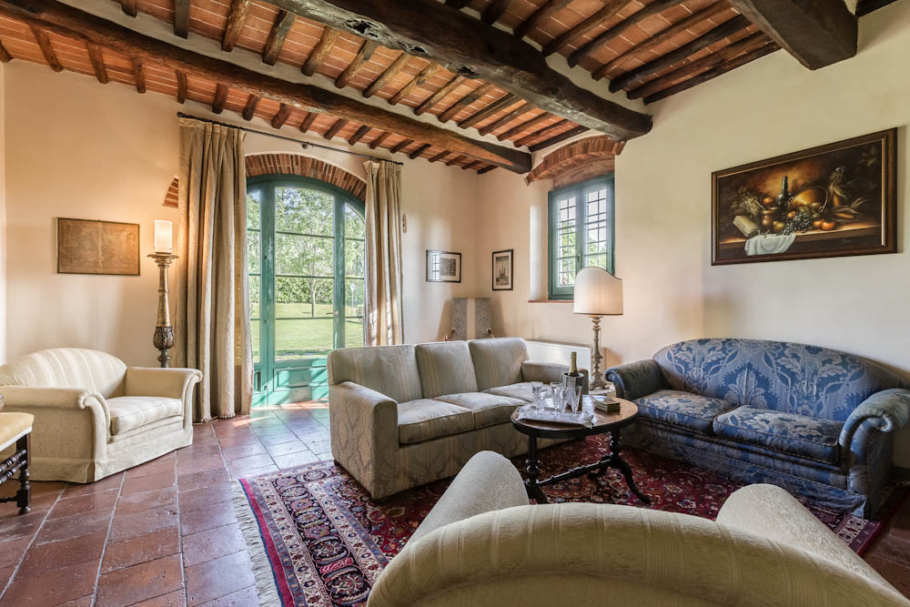 Al piano terra ingresso, salotto con divano letto matrimoniale, salone con caminetto, cucina con due forni, caminetto ed accesso alla veranda con tavolo per 14 persone dove è possibile mangiare all’aperto, una camera matrimoniale con caminetto che conduce alla veranda con vista sulla piscina, un bagno con doccia idromassaggio, lavanderia con lavatrice. Al primo piano una camera matrimoniale con bagno con doccia idromassaggio, una camera matrimoniale con bagno con doccia e vasca idromassaggio, una camera doppia (che condivide il bagno con una delle due camere matrimoniali).