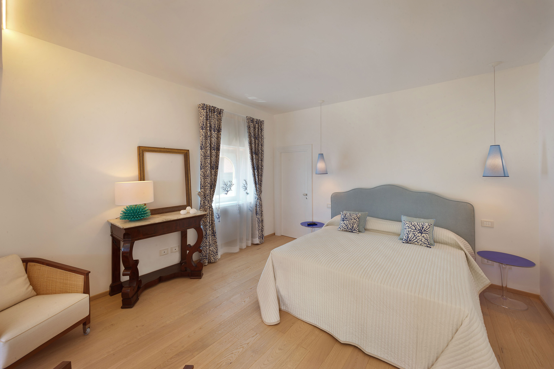 La quarta camera da letto con bagno en-suite ha un letto matrimoniale, un piccolo divano, due poltrone, una scrivania, un televisore satellitare, aria condizionata e riscaldamento. La camera ha un terrazzo privato con una bellissima vista del mare. Il bagno è dotato di lavabo, box doccia, wc, bidet e asciugacapelli. Raggiungerete la stanza dal corridoio.