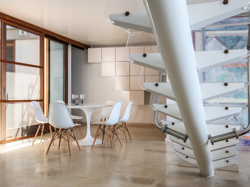 Nel piano rialzato è presente la camera da letto padronale, con bagno privato, salotto con torretta panoramica ed accesso alla terrazza privata.
