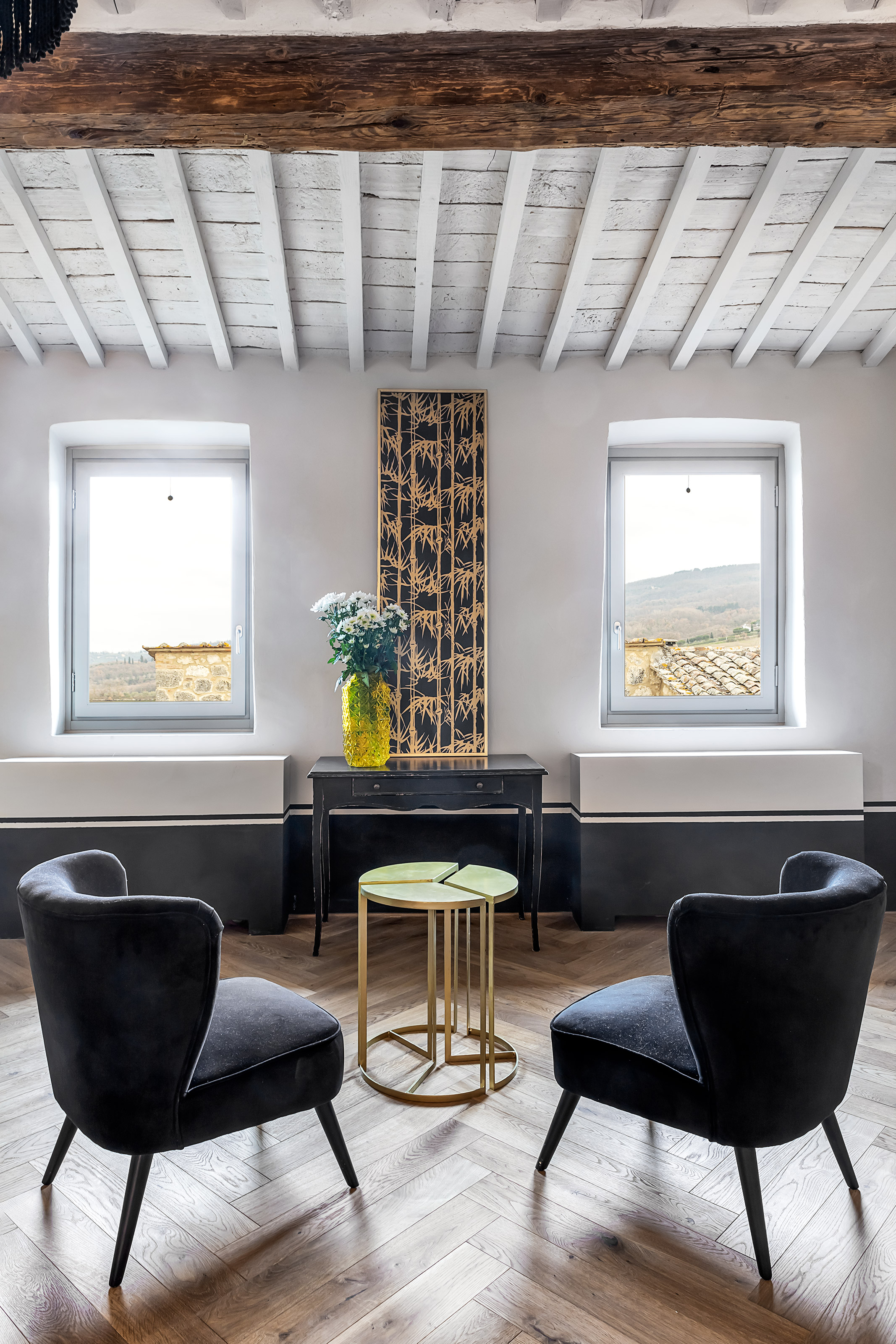 Suite della Torre – letto king-size, area salotto, guardaroba walk-in, bagno privato con vasca/doccia, e vista sulla campagna