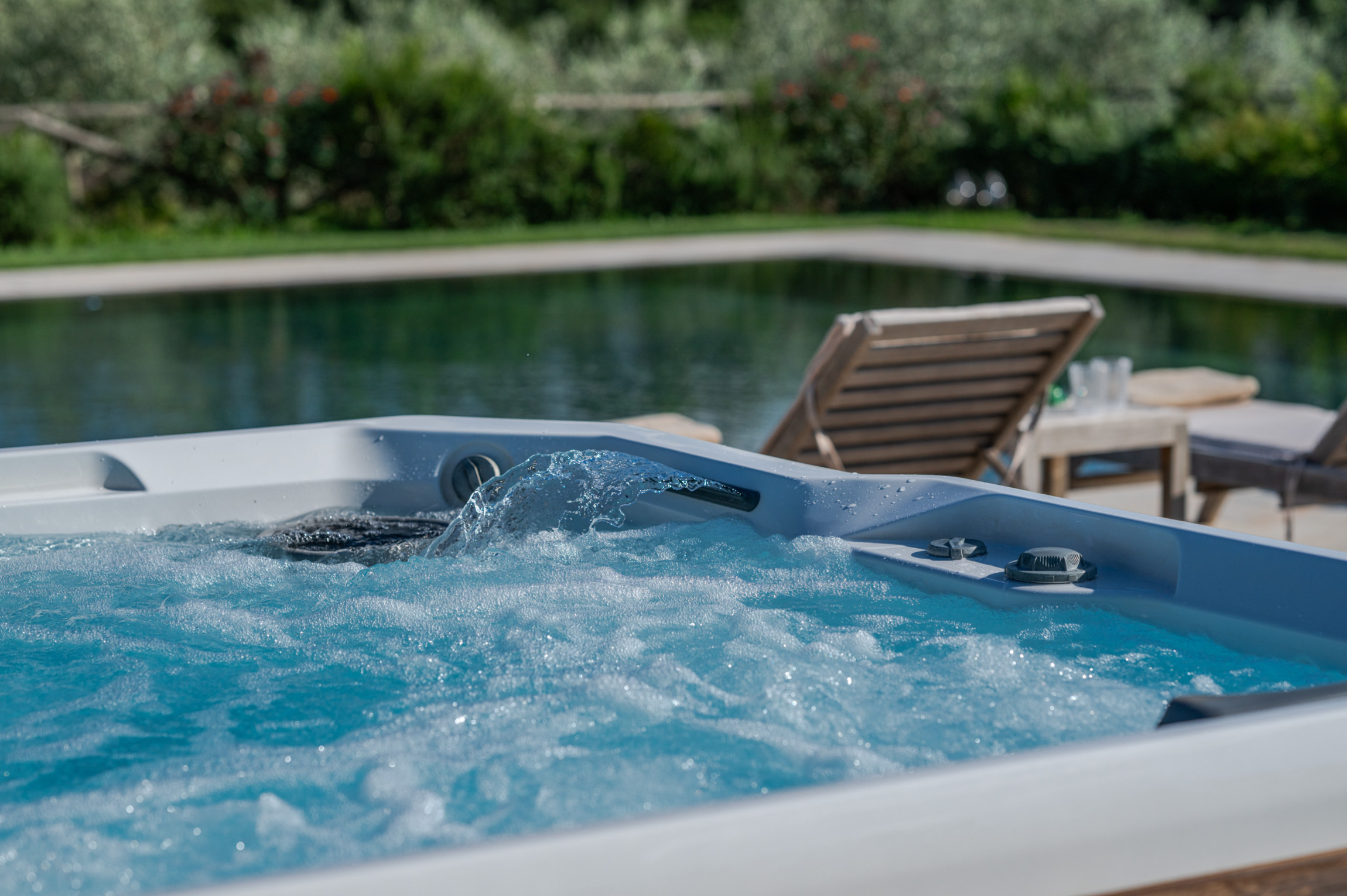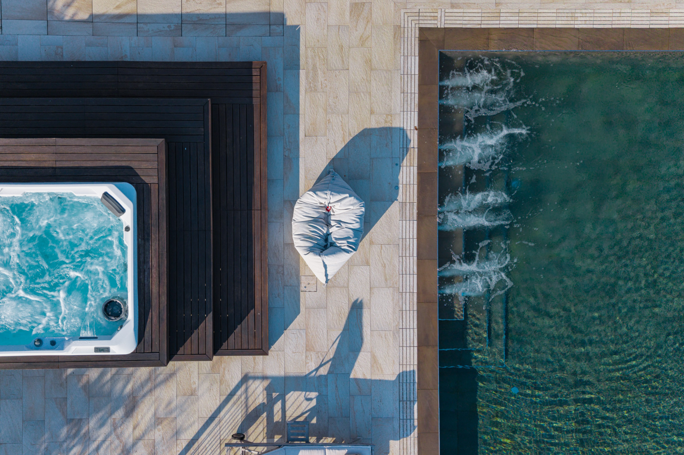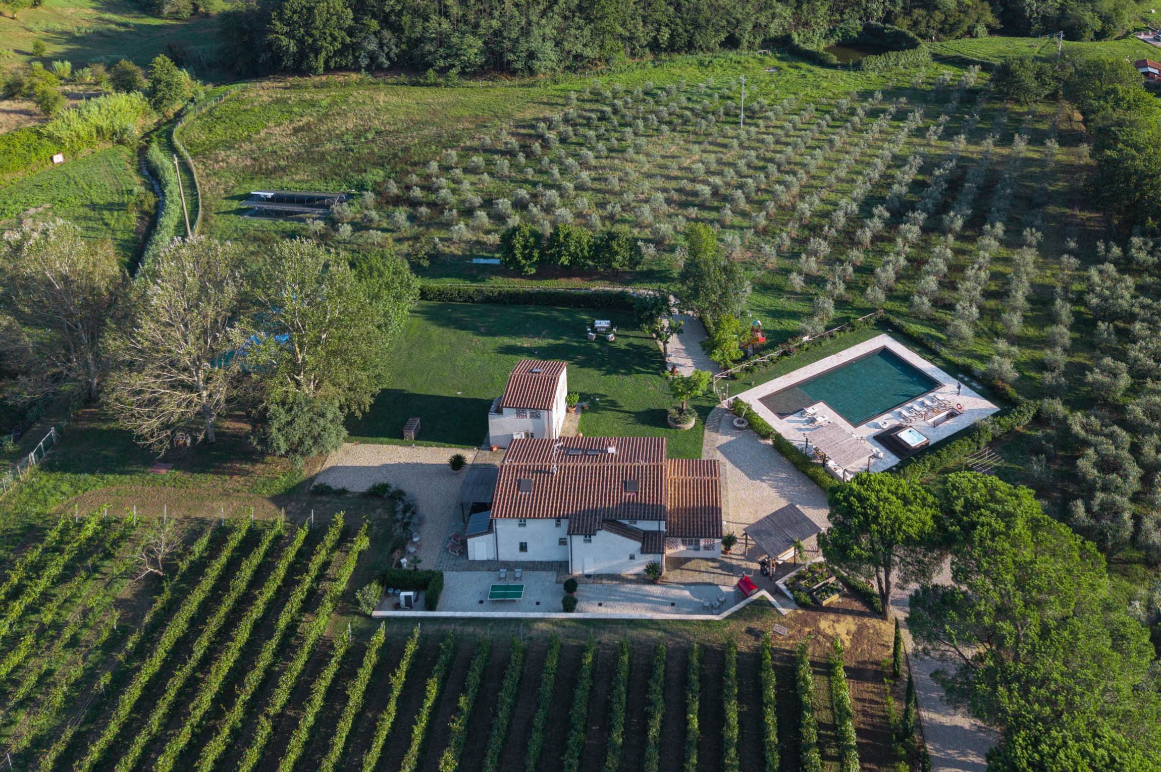 La piscina ha un'altezza massima di 1,40 metri e dispone di scale e scivolo per l'accesso, oltre che di un'area idromassaggio interna. L'area Piscina offre una vasca idromassaggio a 6 posti con scala in legno. È inoltre presente una vasca idromassaggio da 6 posti con vista sul vigneto e con accesso diretto da una camera al piano terra. Completano la zona piscina 5 ombrelloni, più di 20 chaise longue e sedie da piscina con tavolini, enormi cuscini esterni e una doccia. A bordo piscina gli ospiti possono usufruire di una cucina completa con frigorifero e spazio di archiviazione, una zona cottura a induzione e un tavolo da pranzo. Accanto alla villa c'è una zona pranzo all'aperto "a pergola", con un nuovo barbecue a gas e tavolo e sedie in legno per tutti, accanto alla cantina e con vista sulle colline intorno alla villa. Il giardino intorno alla villa dà la possibilità a bambini e ragazzi di giocare o semplicemente di passeggiare.