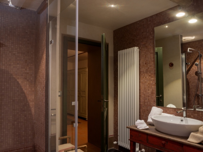 Piano Primo: con accesso da scala esterna coperta alla quale si accede dal porticato oppure da ponte in legno sul retro della villa, salotto con divani, Tv Satellitare e tipico forno a legna nella loggia panoramica, ampio soggiorno-pranzo con antico camino e cucina. Due camere matrimoniali entrambe con bagno privato con doccia, camera matrimoniale adatta a disabili con bagno privato con doccia adatto a disabili.