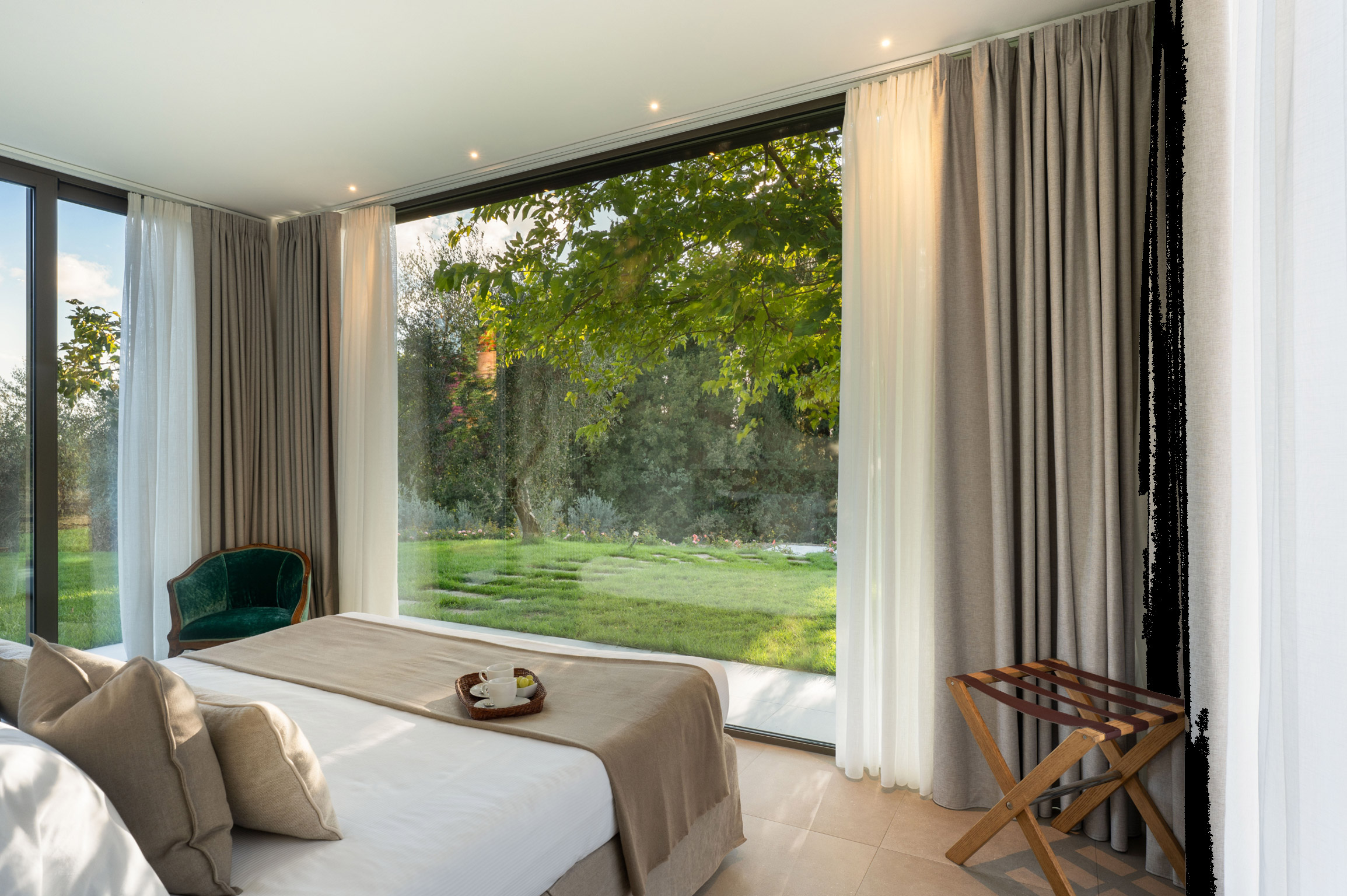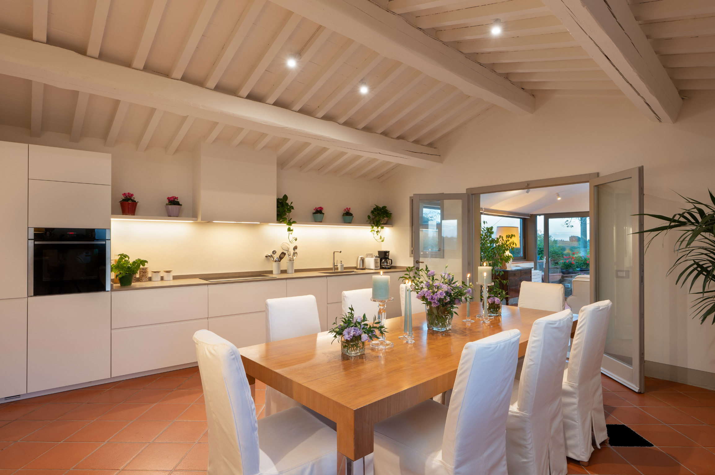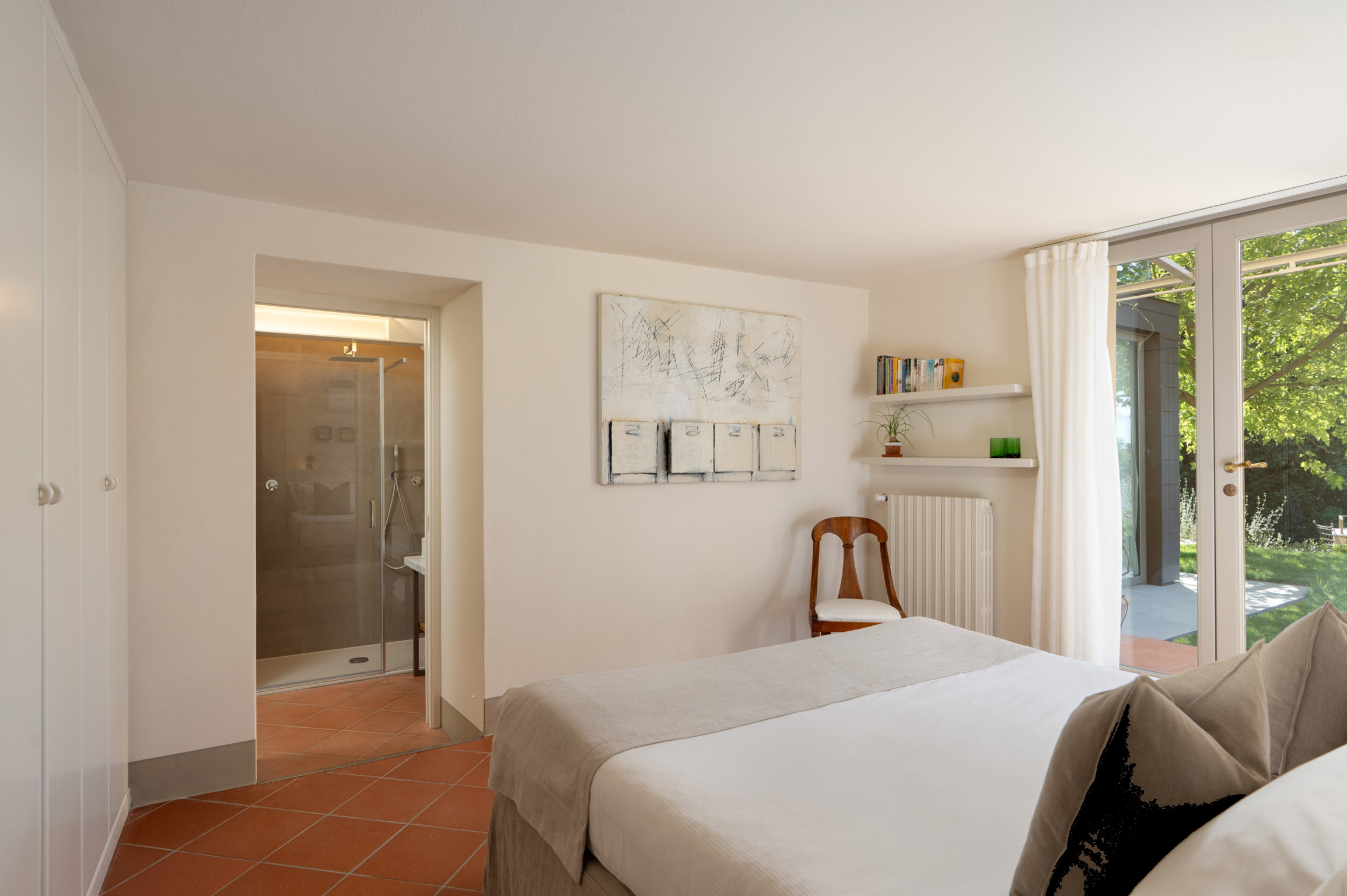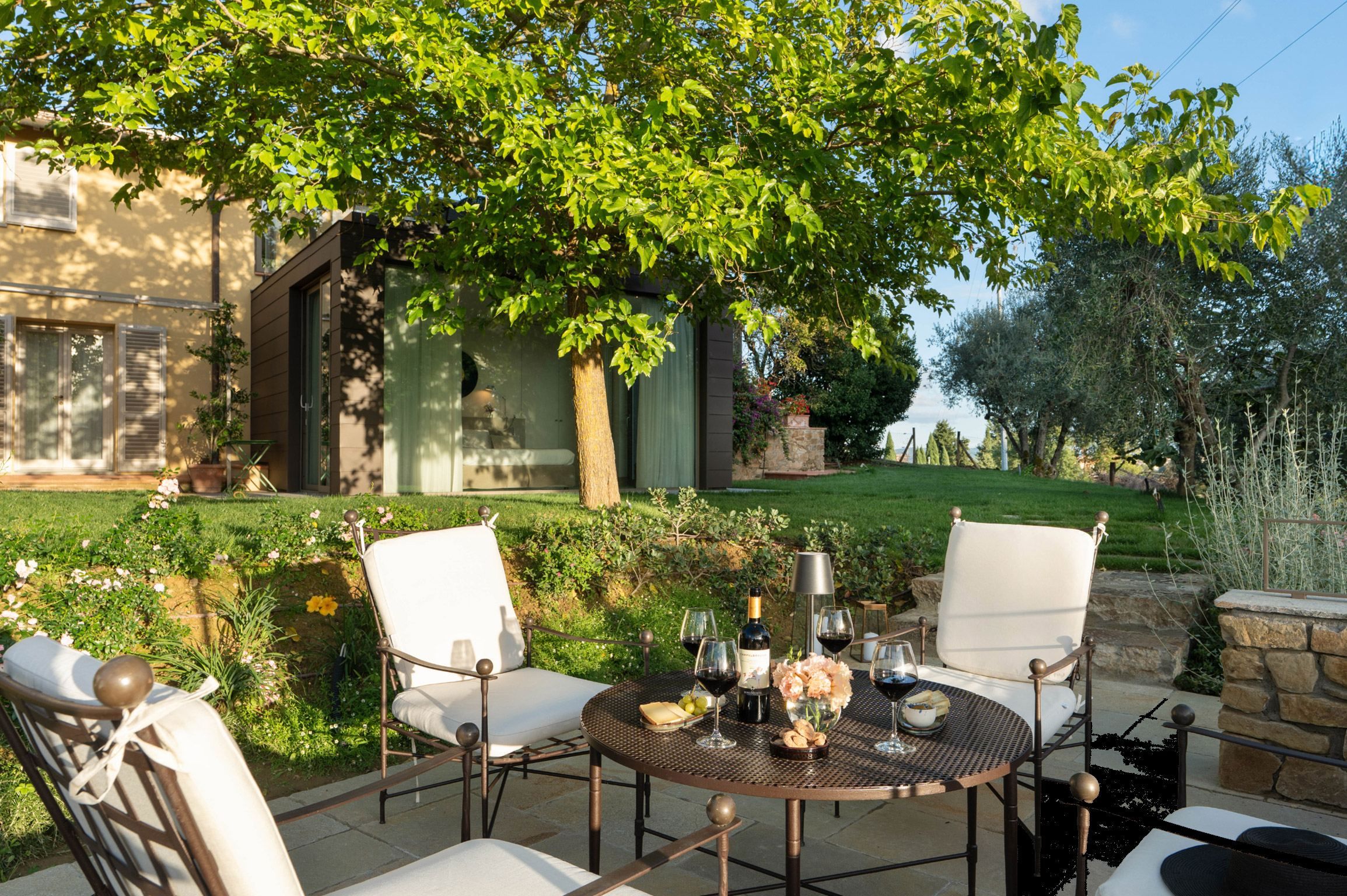 Accanto alla villa si trova un raffinato cottage indipendente, articolato su due livelli: al piano principale una camera twin con bagno, un’ampia cucina con sala da pranzo e una splendida veranda panoramica in vetro trasformata in salotto, con accesso diretto alla terrazza esterna. Al piano superiore, la nuova suite matrimoniale con grandi vetrate e bagno privato offre un ambiente romantico e luminoso con vista sulle colline del Chianti.