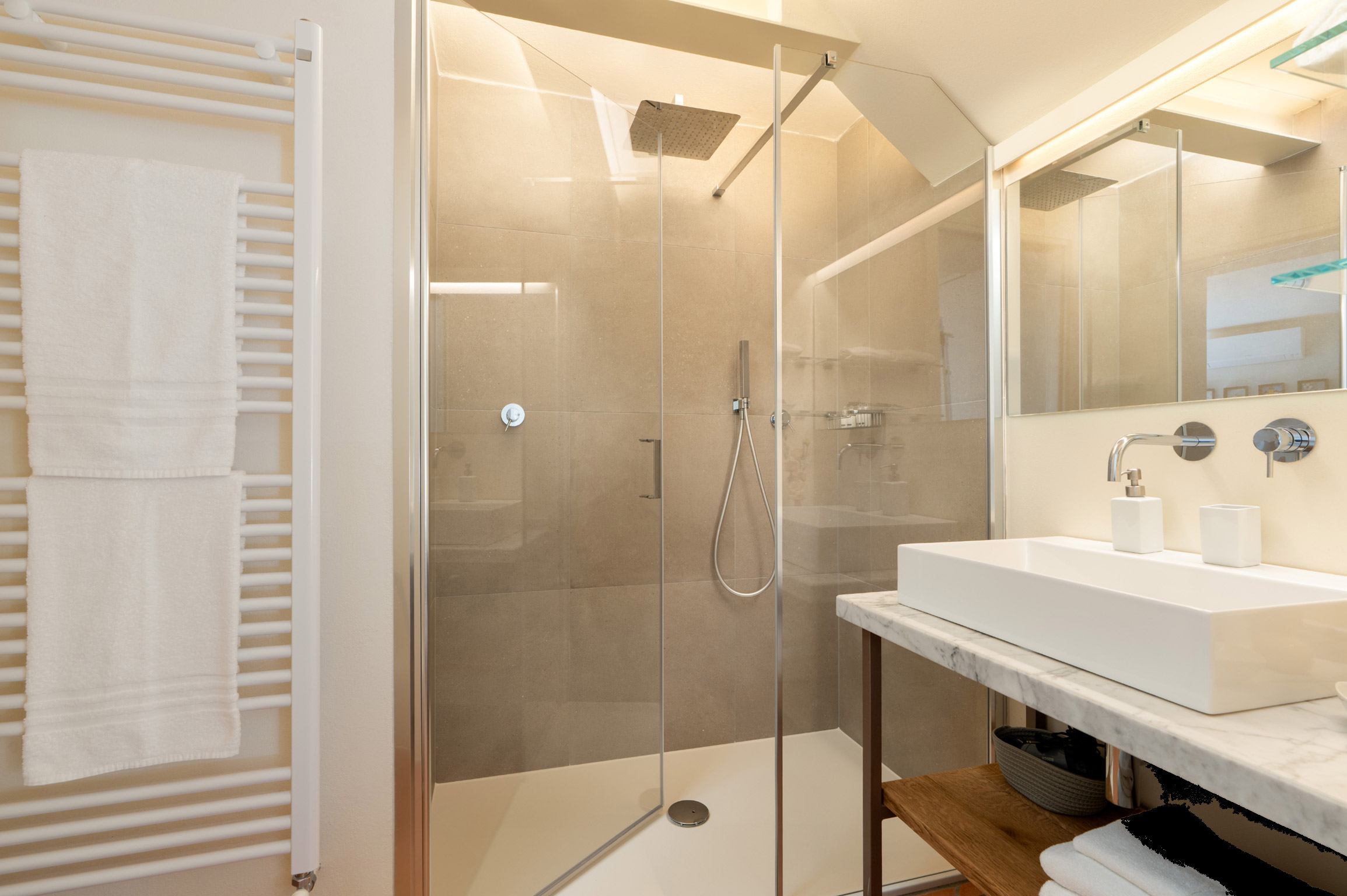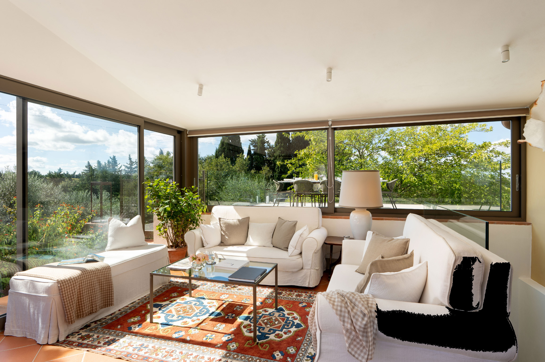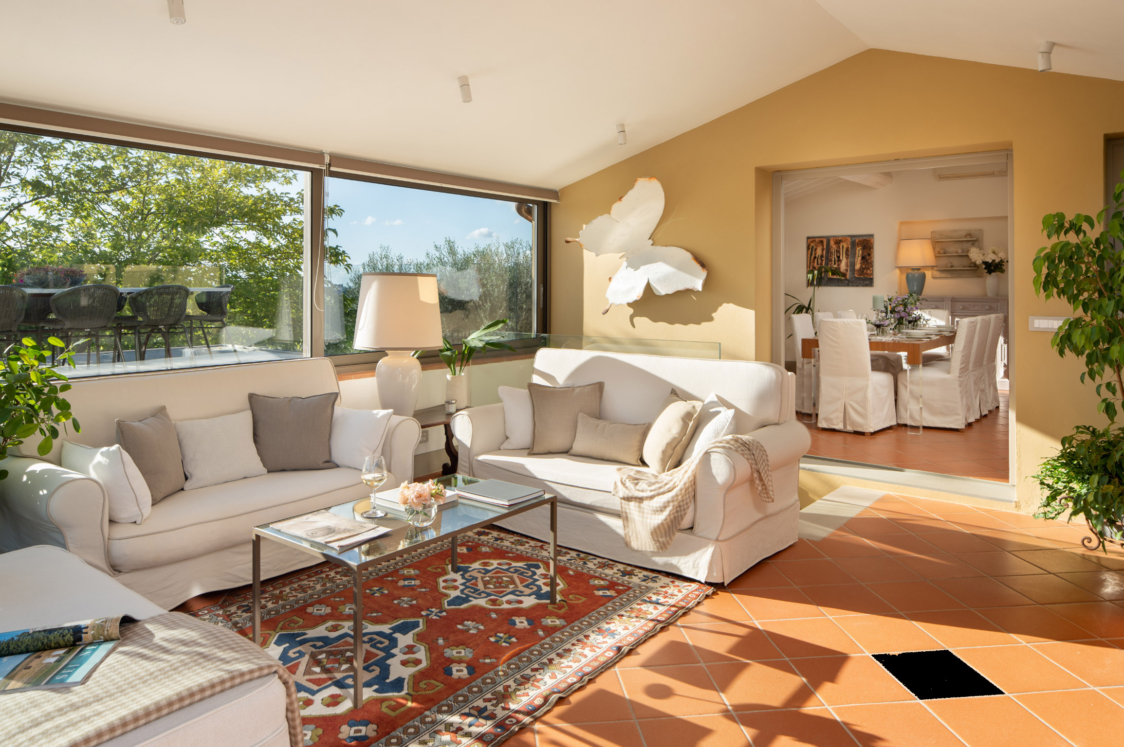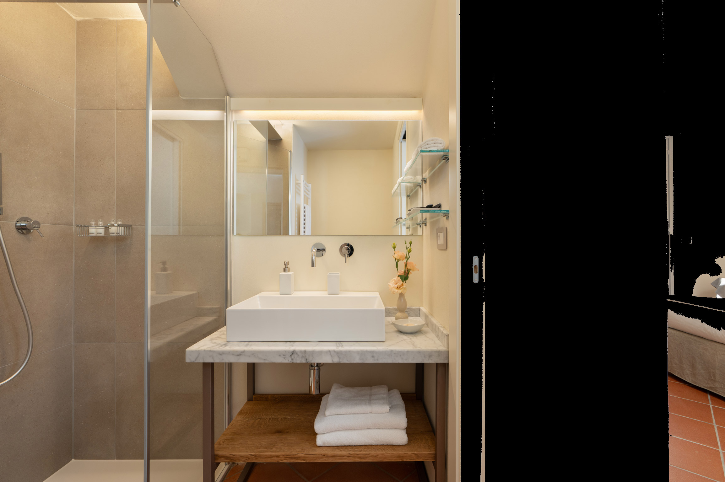 Accanto alla villa si trova un raffinato cottage indipendente, articolato su due livelli: al piano principale una camera twin con bagno, un’ampia cucina con sala da pranzo e una splendida veranda panoramica in vetro trasformata in salotto, con accesso diretto alla terrazza esterna. Al piano superiore, la nuova suite matrimoniale con grandi vetrate e bagno privato offre un ambiente romantico e luminoso con vista sulle colline del Chianti.