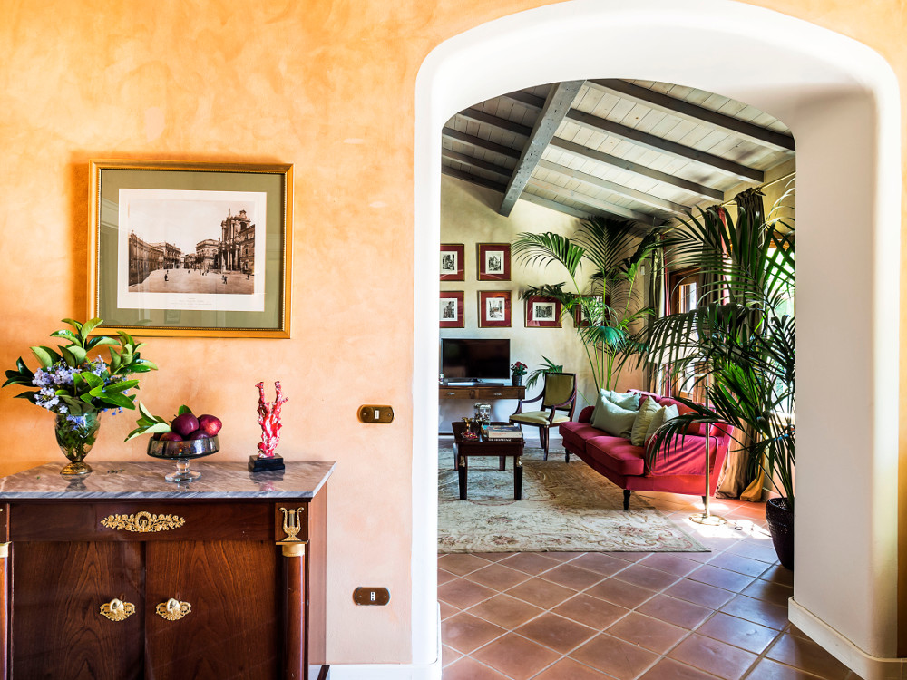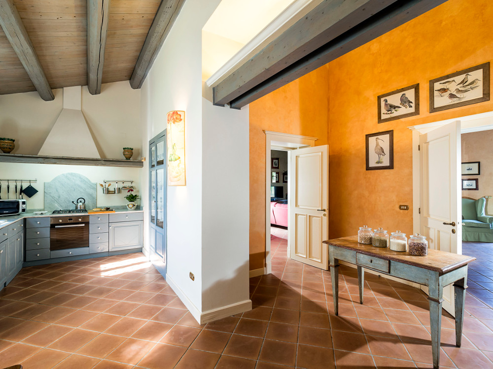 Disposti su un unico livello, gli eleganti ambienti interni della villa sono arredati con gusto classico e comprendono un ampio soggiorno-pranzo, una cucina e la dispensa, una camera matrimoniale con spogliatoio e bagno privato con doccia, due camere matrimoniali, due camere singole e due bagni, uno con doccia e l’altro con vasca. La villa è circondata da un ampio giardino con piscina, solarium, porticato e terrazza.