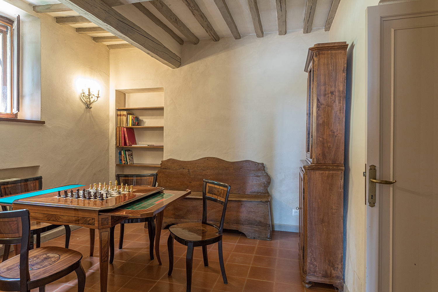 Villa del suono presenta l'architettura toscana e offre ampi spazi per intrattenimento e relax. Può ospitare fino a 11 persone, con un piano terra accogliente e spazioso composto dall'ingresso, dall'ampio soggiorno con camino, dal salotto e dalla spaziosa sala da pranzo. Nella villa troverete poi una sala giochi e sala Tv oltre ad una grande cucina con camino e barbecue, come si usava nella tradizione. Al primo piano, oltre all'elegante sala con il biliardo, si trovano quattro camere da letto matrimoniali, una camera doppia e una camera singola, tutte dotate di bagno privato con doccia. All'interno vi è inoltre una zona lavanderia con lavatrice asse da stiro e ferro esclusivo.